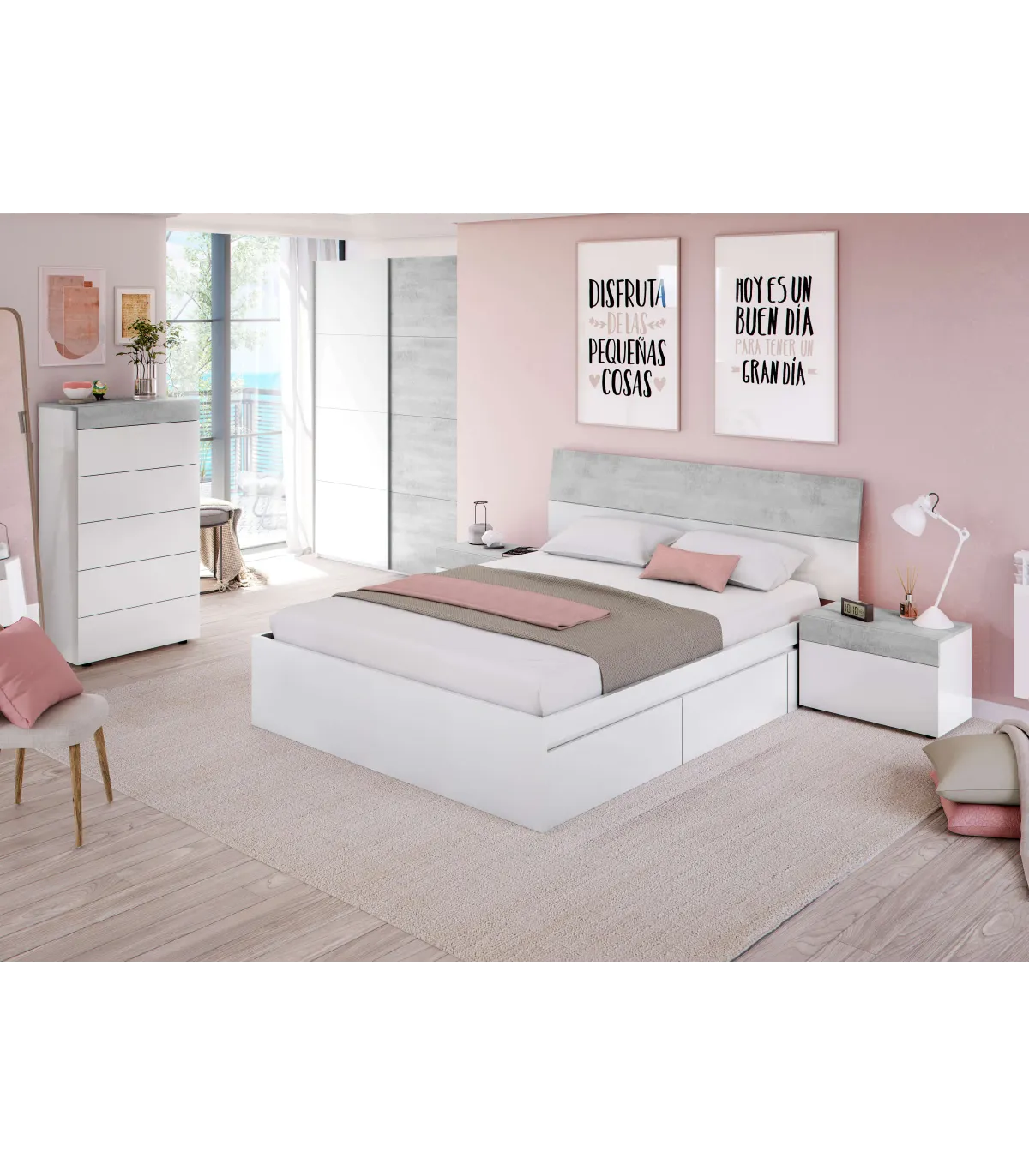 Conjunto cumpuesto por un cabecero y 2 mesitas en tonos Blanco artik y cemento, tonos muy en tendencia tanto por la elegancia que aportan como por la amplitud que dan a la habitación.