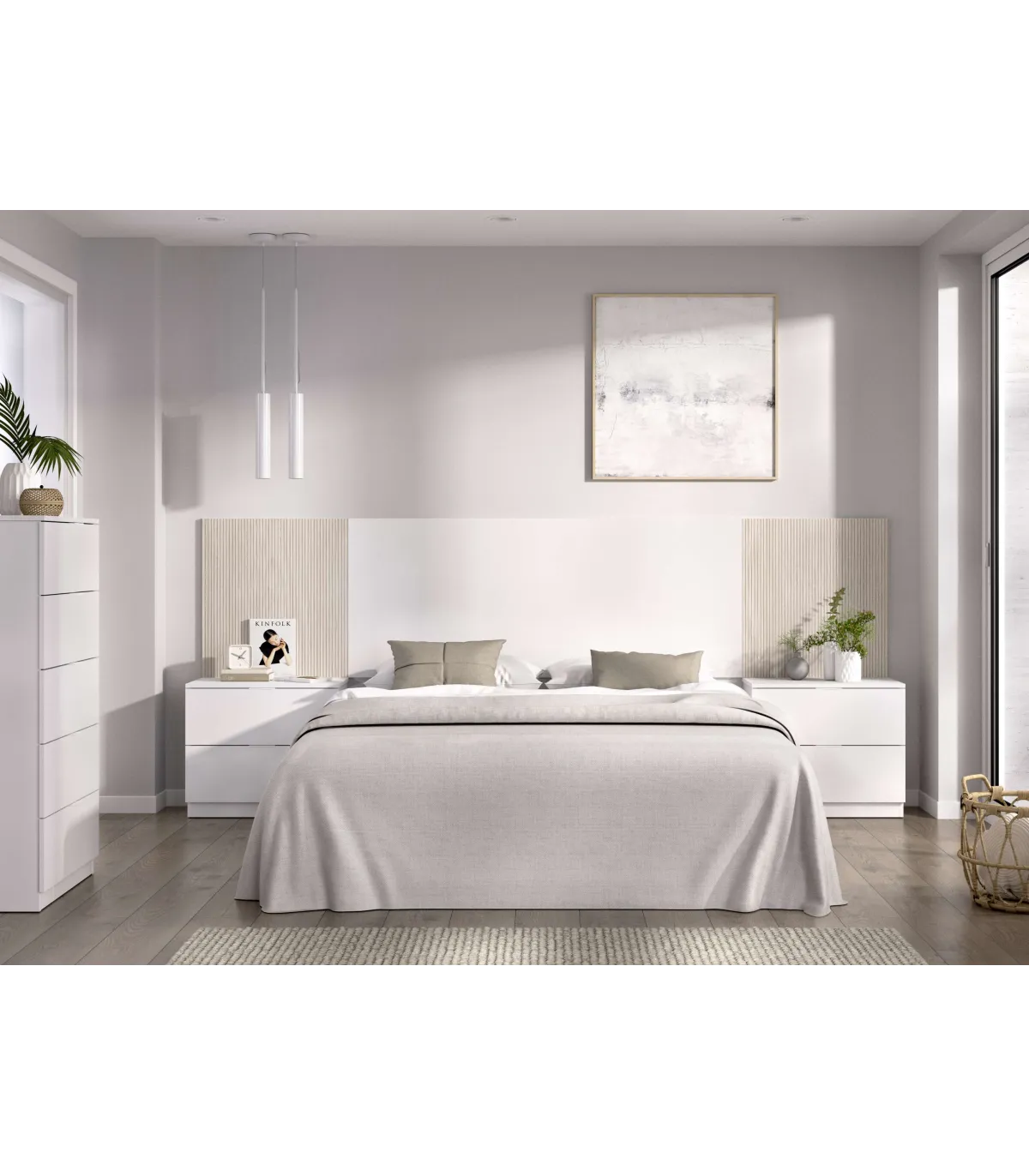 Transforma tu dormitorio con el conjunto Lula, elegante y funcional · acabado blanco · diseño alistonado natural.