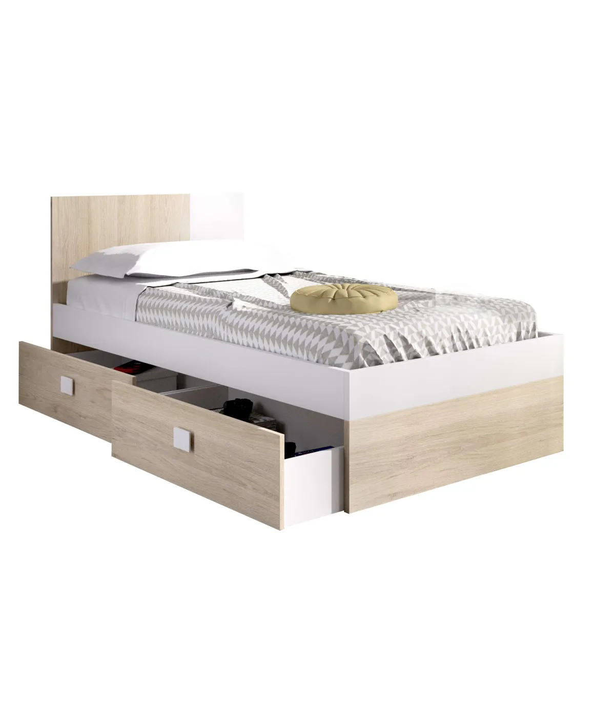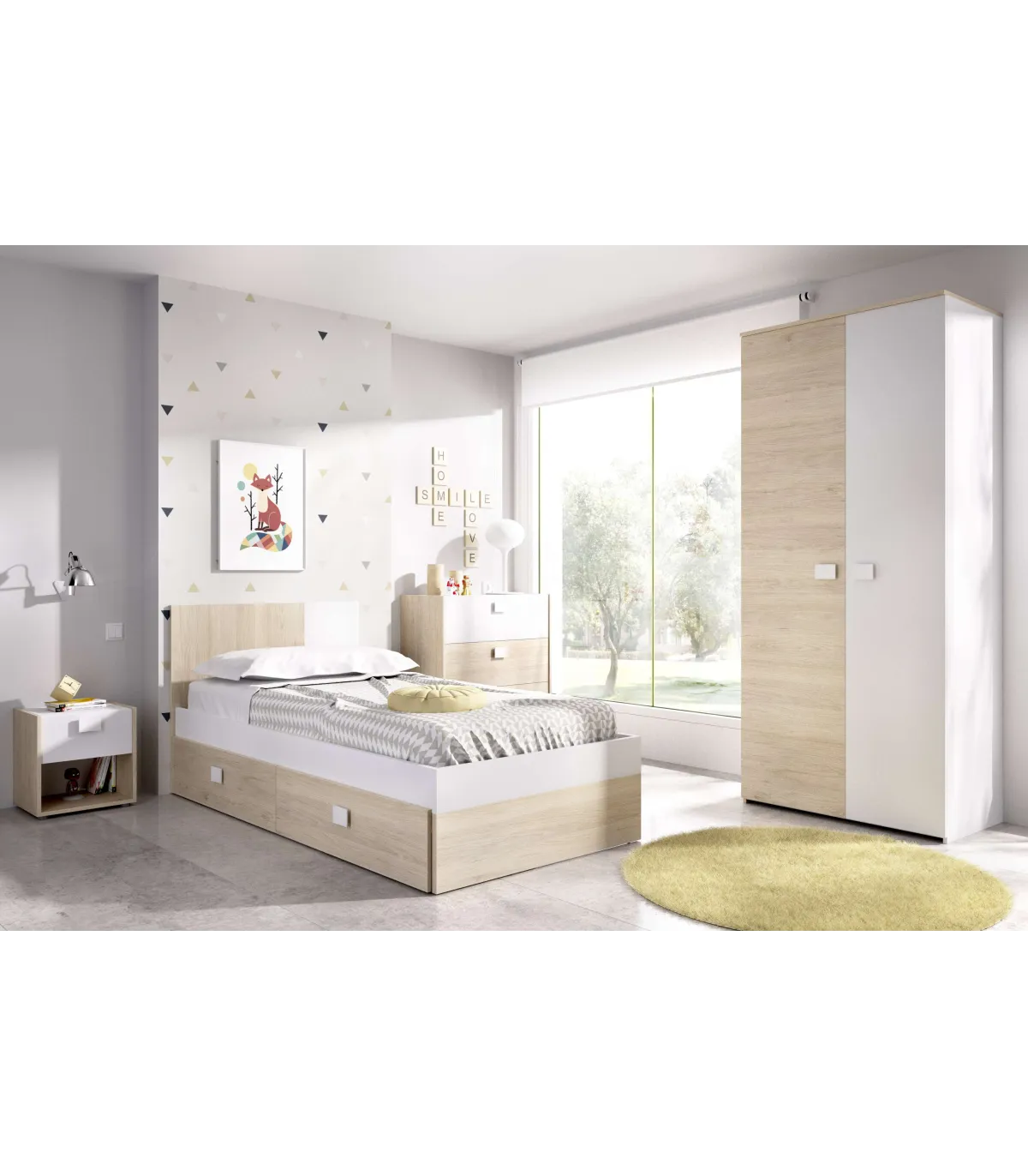 Conjunto juvenil cama de 90 con cajones, mesita, armario y cómoda Duna-4 acabado natural/blanco.