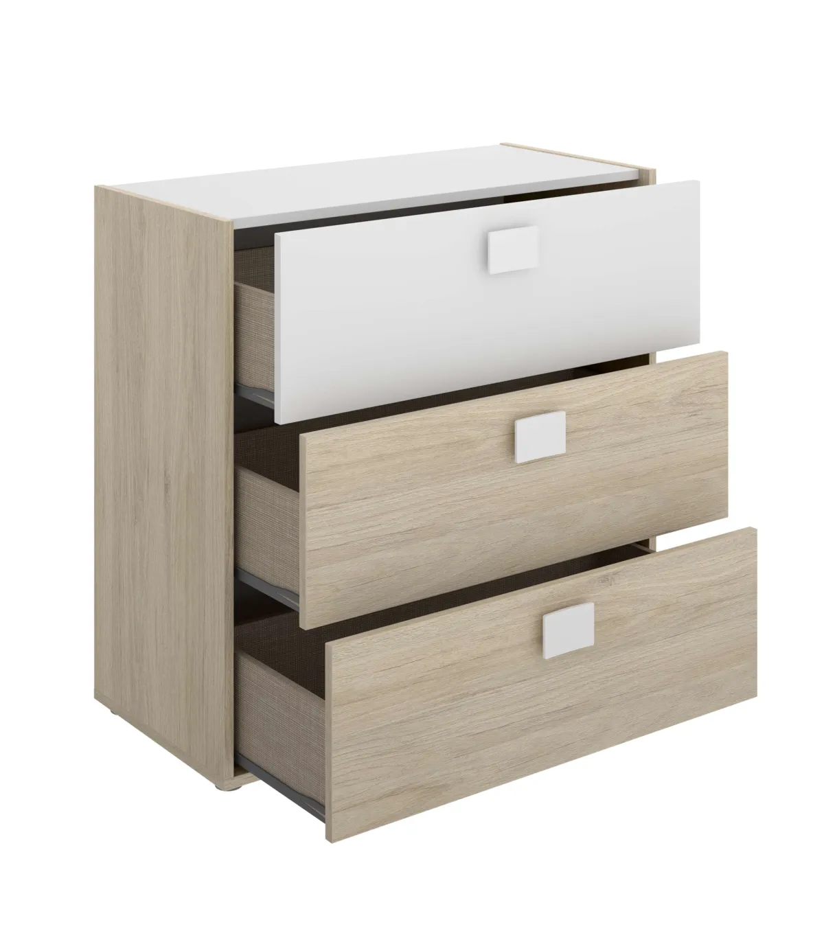 Cajones mesita y cómoda con guías metálicas de suave deslizamiento.