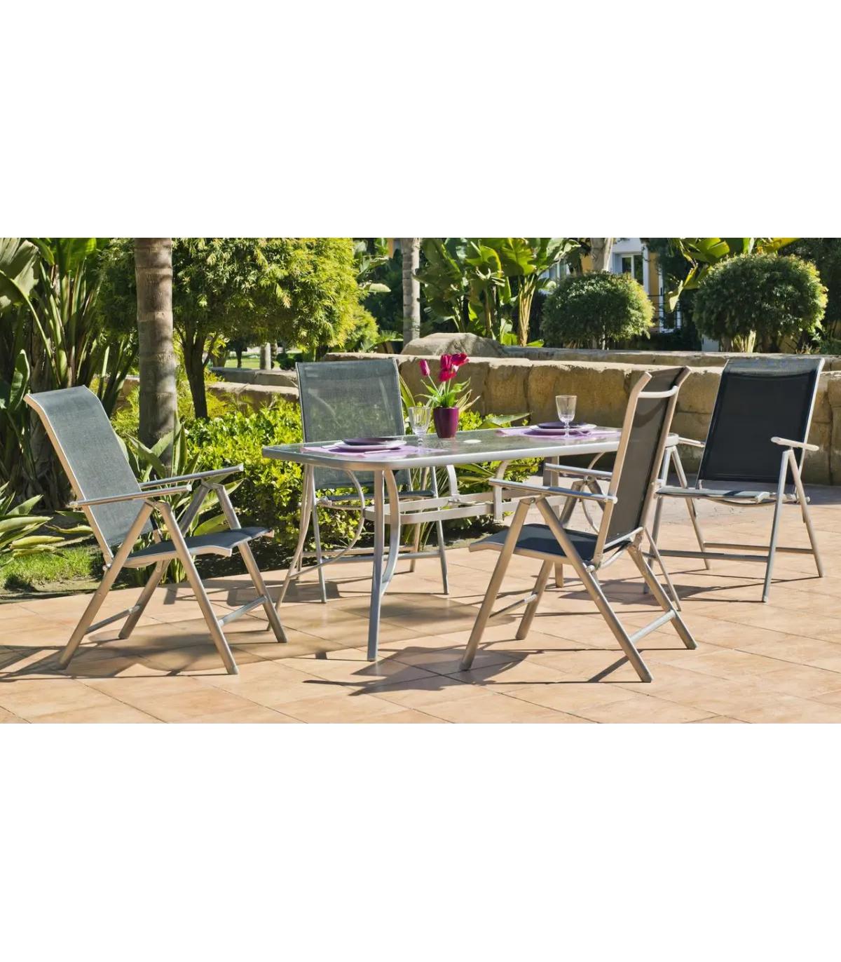 Conjunto de acero color plata: mesa de 150x90 cm con tablero de cristal templado y 4 tumbonas multiposiciones de acero y textilen.