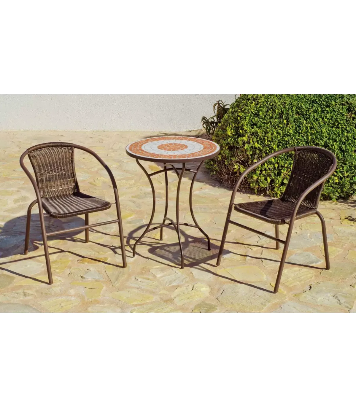 Conjunto terraza jardín mesa + 2 sillones con cojines, de acero color bronce, con tablero circular mosaico, para jardín y terraza.