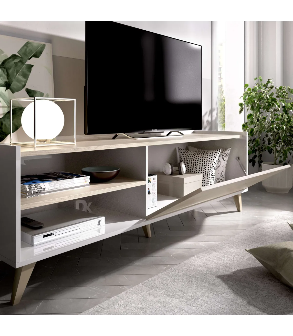Transforma tu salón con el conjunto Cazalilla-6: estilo moderno · acabado blanco/natural · incluye aparador, mueble TV y mesa centro.