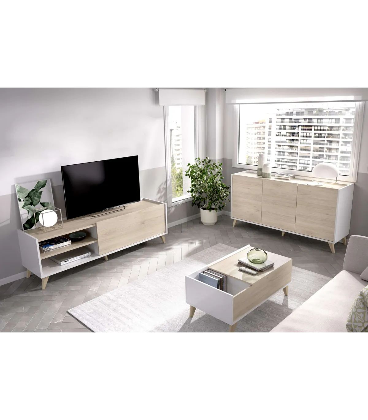 Conjunto salón Cazalilla-6: aparador, mueble TV y mesa centro acabado blanco/natural.