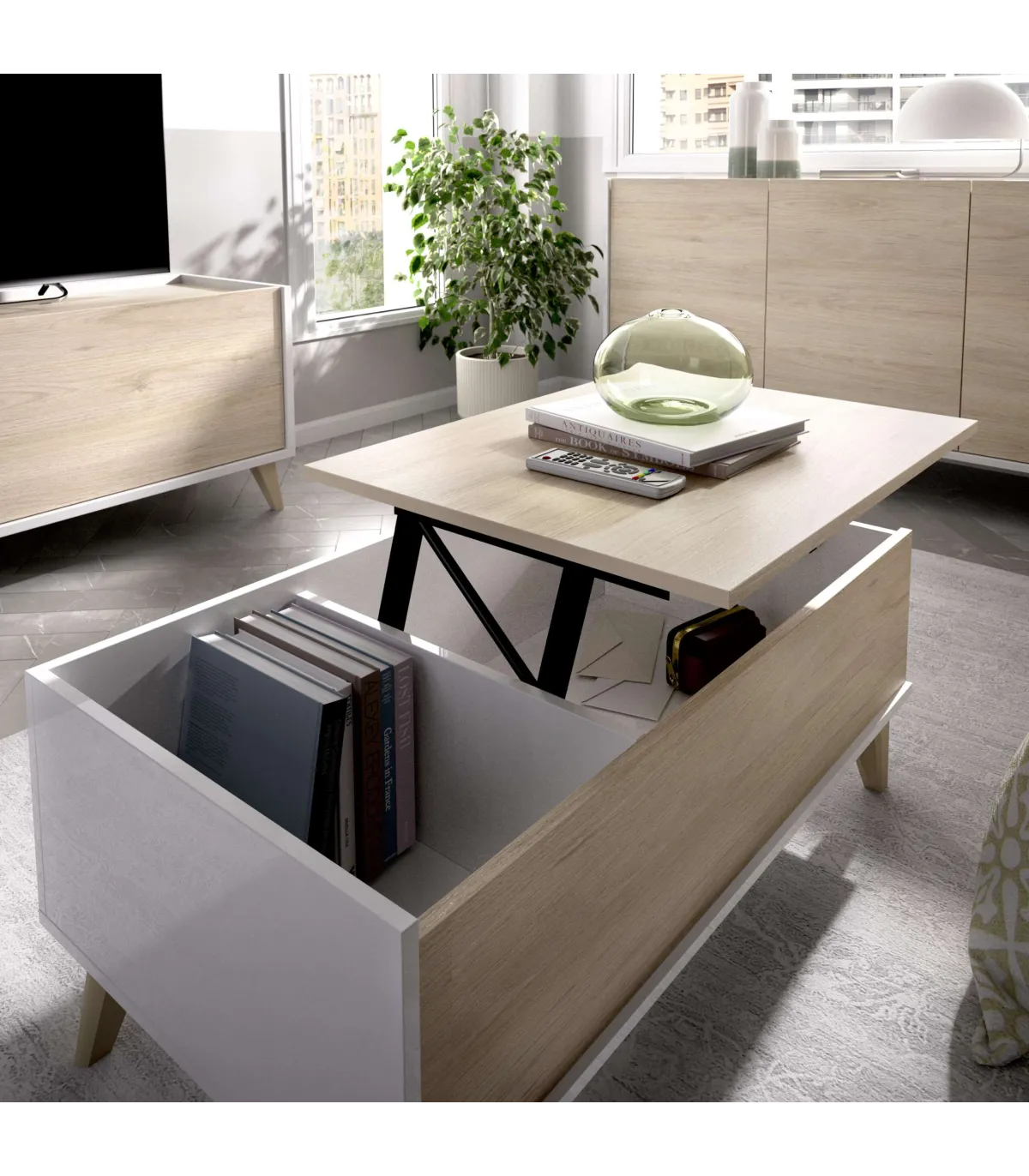 • Mesa centro elevable: Alto 41 cm Ancho 99 cm Fondo 60 cm .