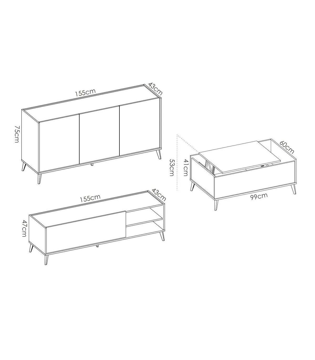 • Mueble TV: Alto 47 cm Ancho 155 cm Fondo 43 cm.