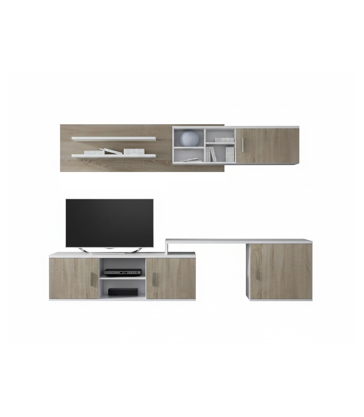 Fantástica composición de salón en blanco y cambrian con ancho variable, es decir, el módulo bajo se puede montar en el mueble de TV. Te lo entregamos prácticamente montado (a falta de unir los módulos).