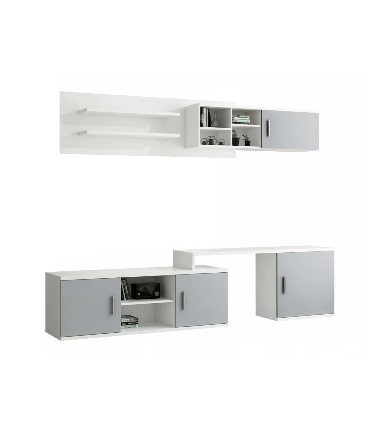 Fantástica composición de salón en blanco y aluminio con ancho variable, es decir, el módulo bajo se puede montar en el mueble de TV. Te lo entregamos prácticamente montado (a falta de unir los módulos).