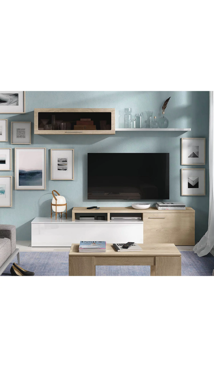 · Conjunto de salón compuesto por mueble de TV, módulo superior con una puerta con cristal y estante colgante.