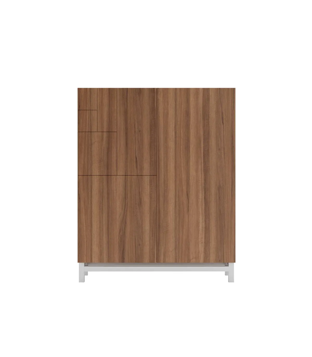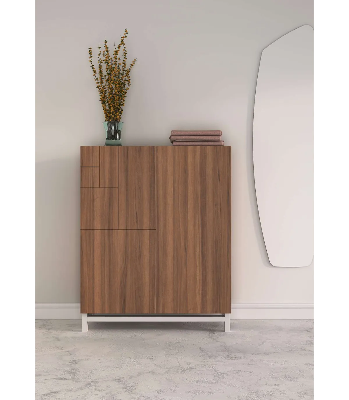 El zapatero es un mueble, fabricadas en melamina de alta calidad en color nogal, diseñado para brindar organización y estilo a tu hogar. Sus patas de madera de haya lacadas en color blanco, le otorgan un toque moderno y elegante. Dispone de 2 puertas y 5 estantes donde podrás tener organizados sus zapatos.