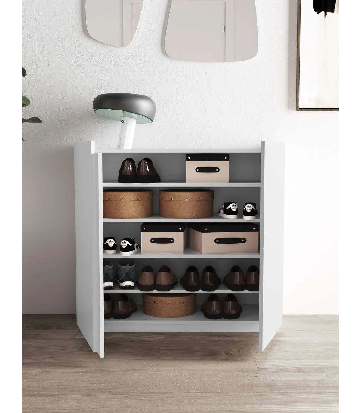 Organiza tu calzado con estilo y funcionalidad · Diseño moderno · 2 trampones · Dimensiones compactas: 60x81.6x25 cm.