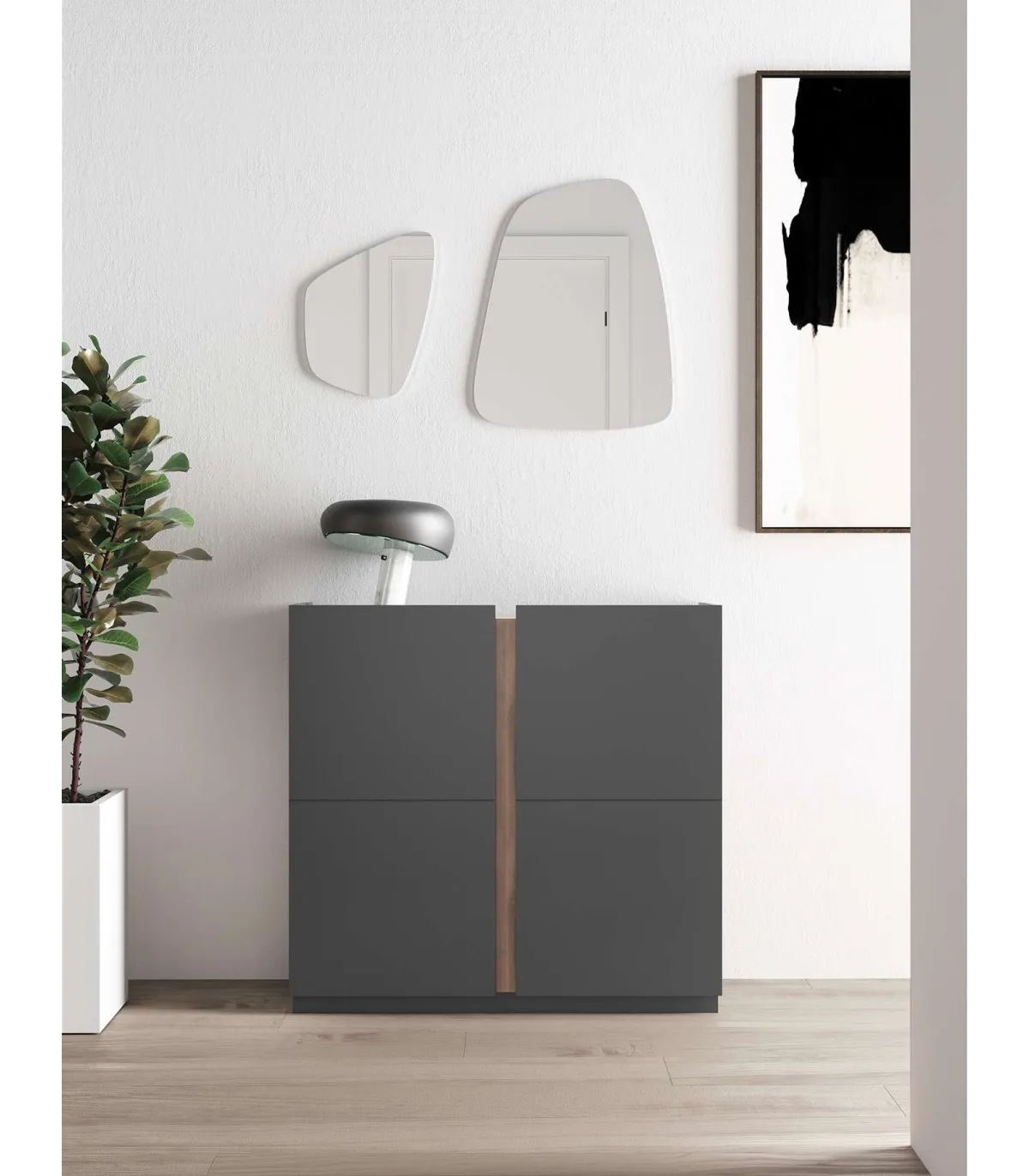 El zapatero multifuncional fabricado en melamina con acabado color grafito combinado con nogal, es un mueble versátil y práctico para organizar tus zapatos. Cuenta con 2 puertas y 4 estantes interiores, ofreciendo un amplio espacio de almacenamiento con capacidad para 18/20 pares de zapatos. Su diseño moderno y atractivo, junto con la combinación de colores, le da un toque estilizado a cualquier habitación. Es una solución ideal para mantener tus zapatos ordenados y fácilmente accesibles.