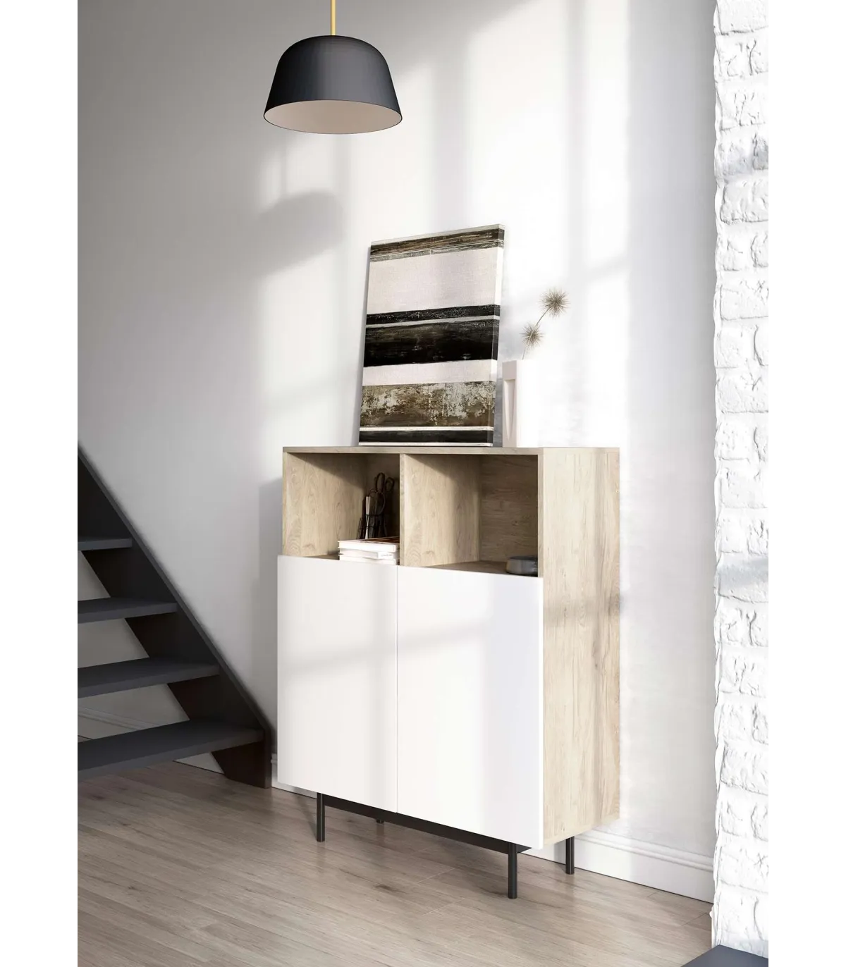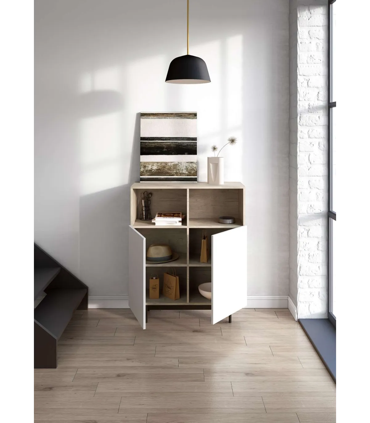Mueble auxiliar multifuncional fabricado en melamina con acabado color roble combinado con blanco, es un mueble versátil y práctico para organizar tus cosas. Cuenta con 2 puertas y 1 hueco, estantes interiores, ofreciendo un amplio espacio de almacenamiento. Es una solución ideal para mantener tus cosas ordenadas y fácilmente accesibles.