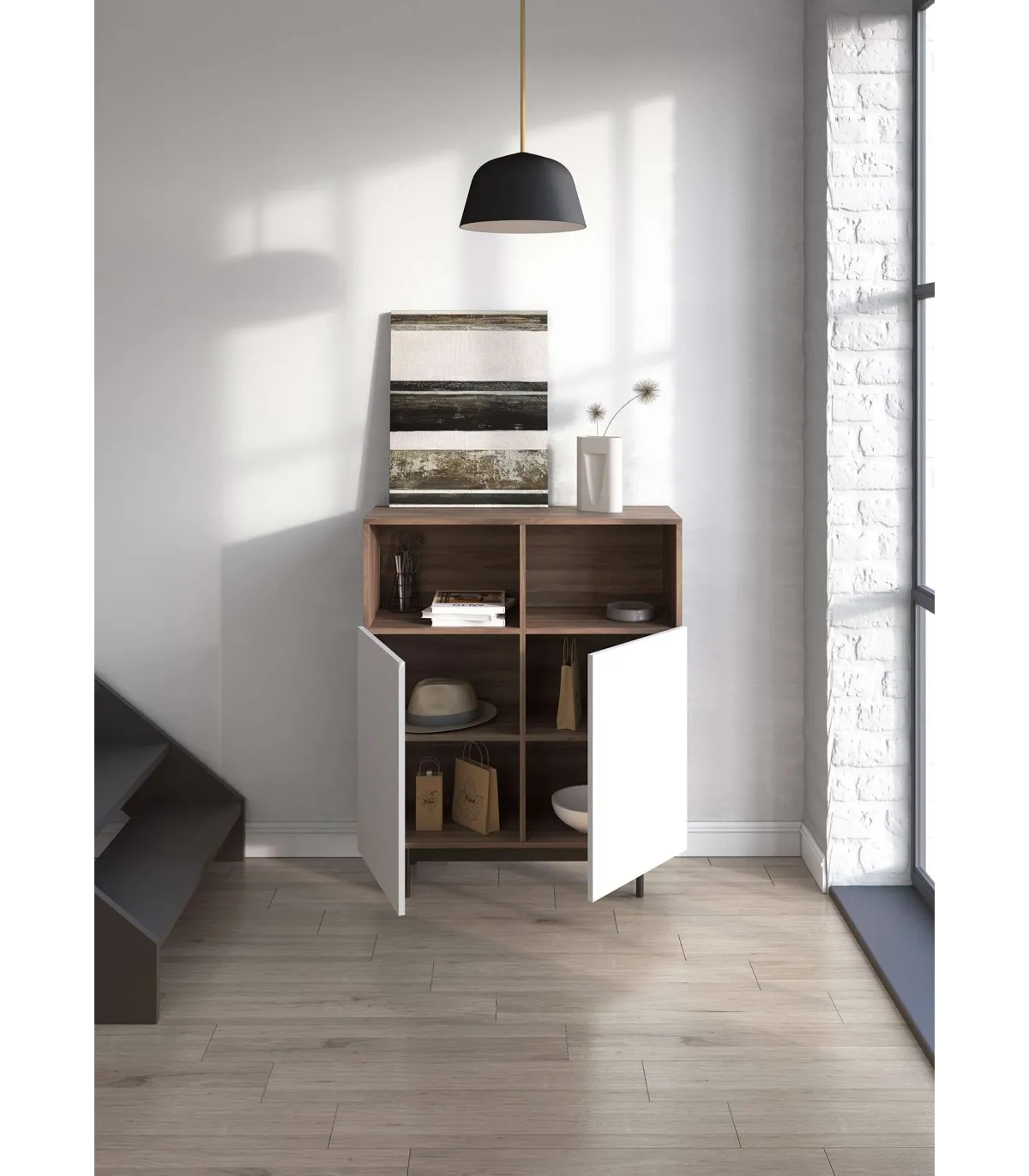 Mueble auxiliar multifuncional fabricado en melamina con acabado color nogal combinado con blanco, es un mueble versátil y práctico para organizar tus cosas. Cuenta con 2 puertas y 1 hueco, estantes interiores, ofreciendo un amplio espacio de almacenamiento. Es una solución ideal para mantener tus cosas ordenadas y fácilmente accesibles.