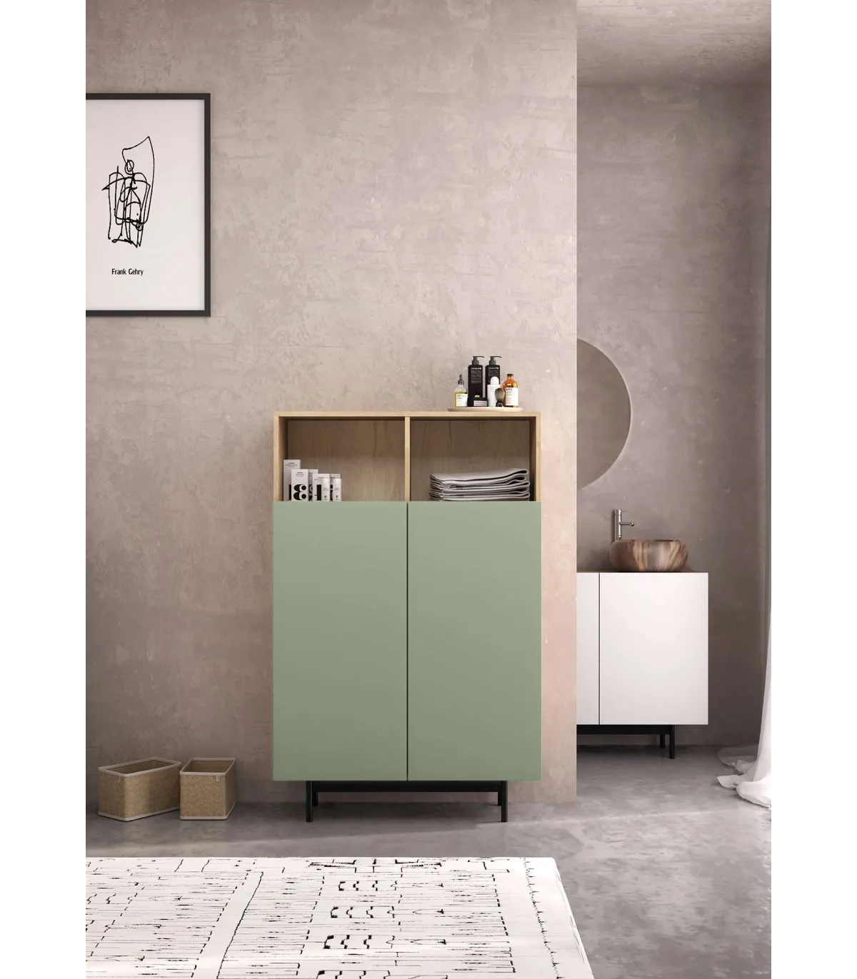 Aprovecha el espacio con el mueble auxiliar 603-1, elegante y funcional · Acabado roble/verde · Medidas 110 x 90 x 34.