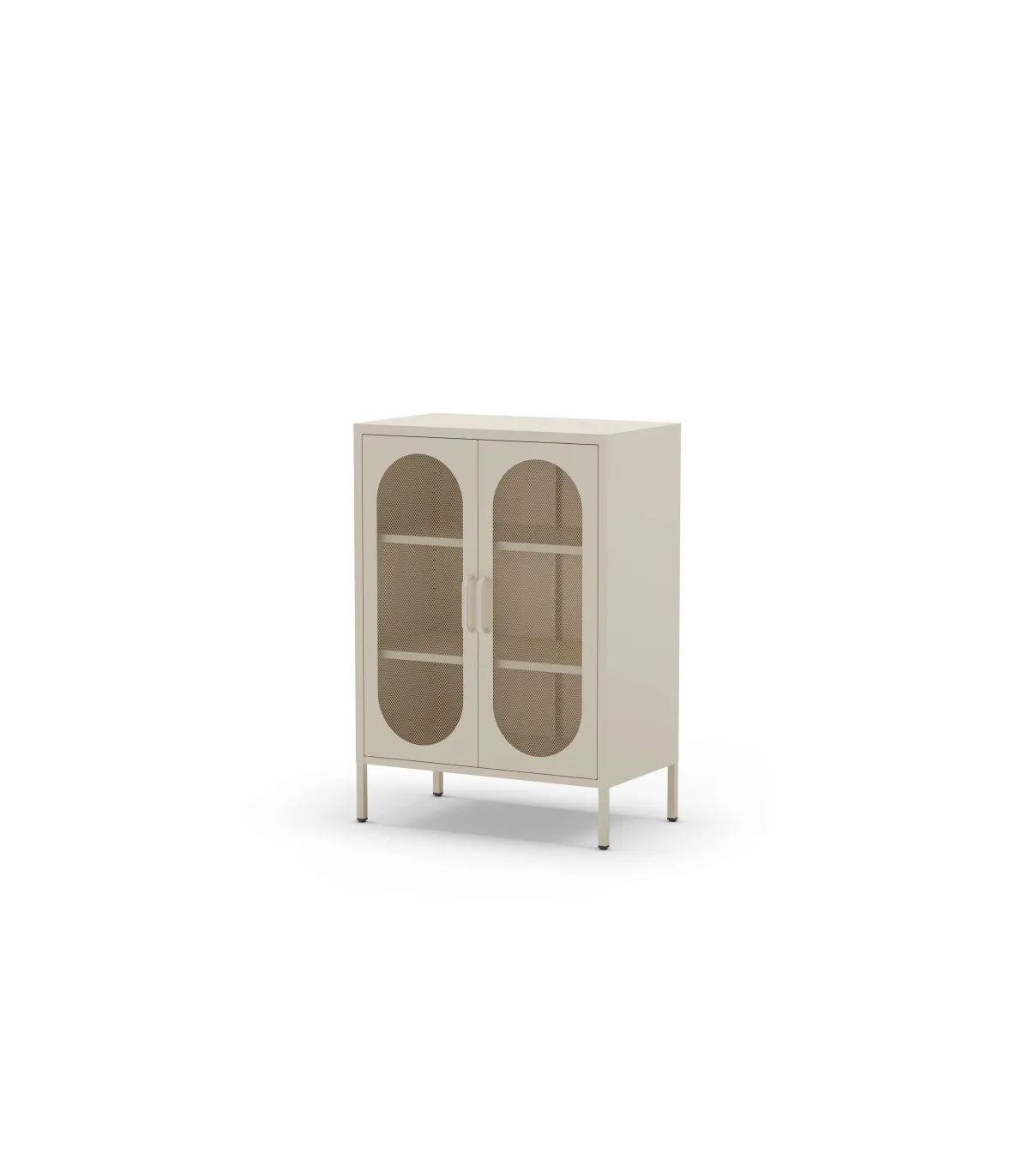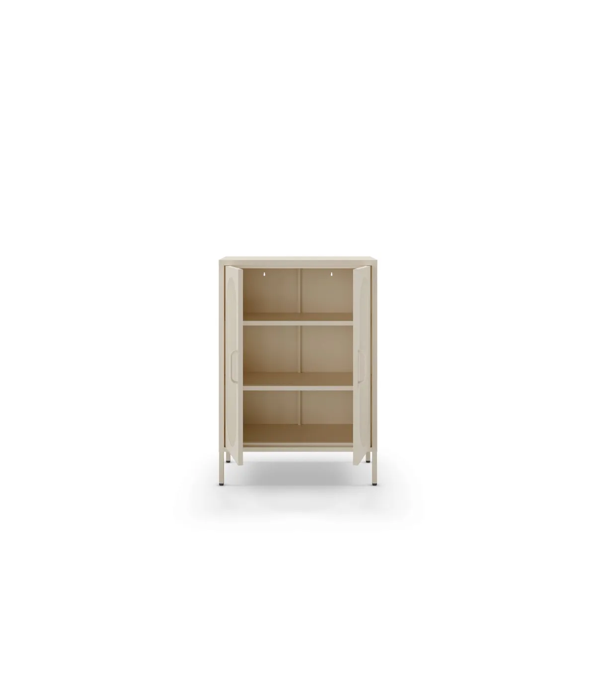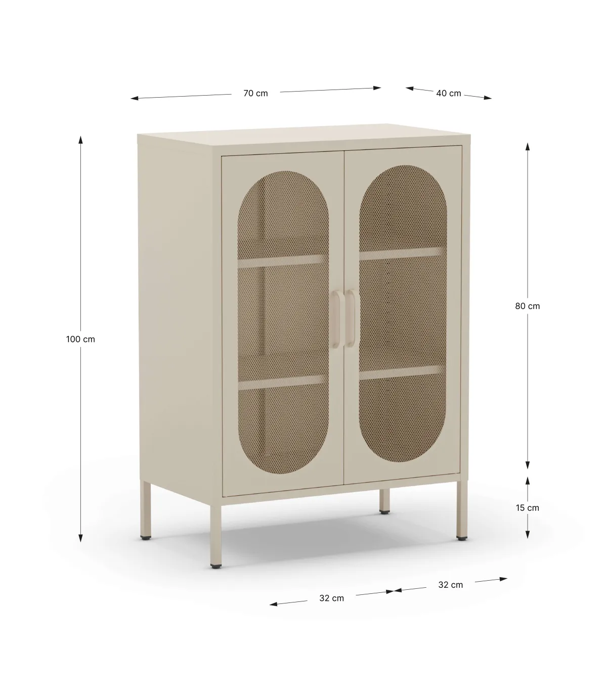 El mueble auxiliar Dora es la solución ideal para organizar tu espacio con estilo. Su diseño versátil con 2 puertas abatibles y dos estantes permite un almacenamiento eficiente, mientras que su acabado en metal crema le otorga un toque moderno e industrial.