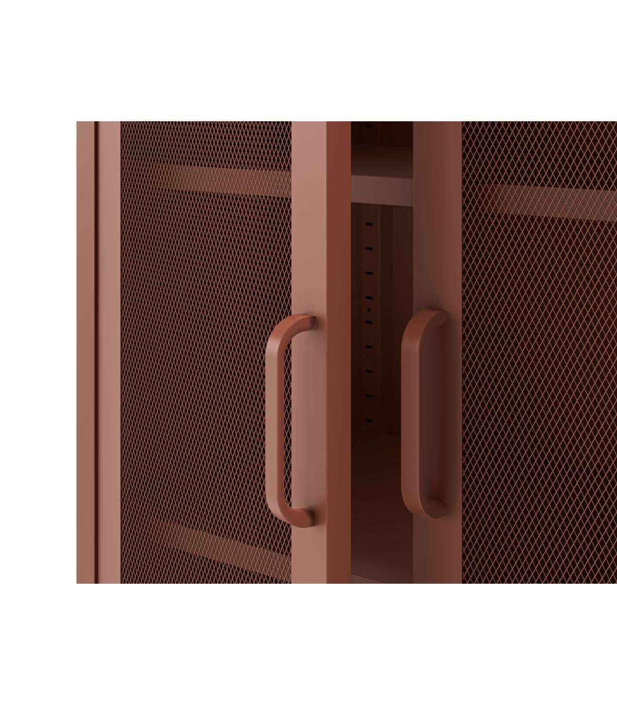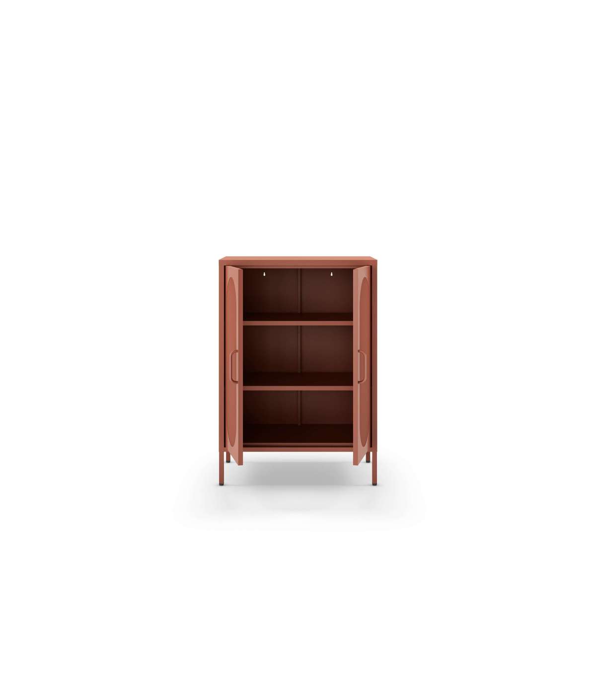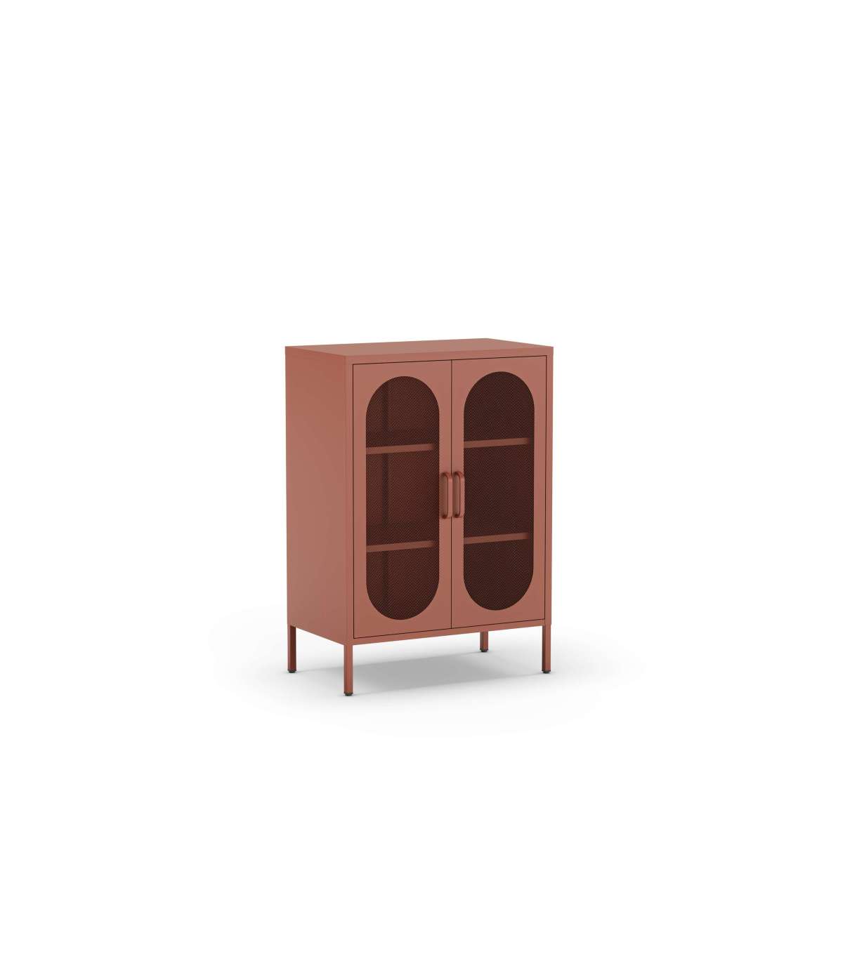 El mueble auxiliar Dora es la solución ideal para organizar tu espacio con estilo. Su diseño versátil con 2 puertas abatibles y dos estantes permite un almacenamiento eficiente, mientras que su acabado en metal terracota le otorga un toque moderno e industrial.