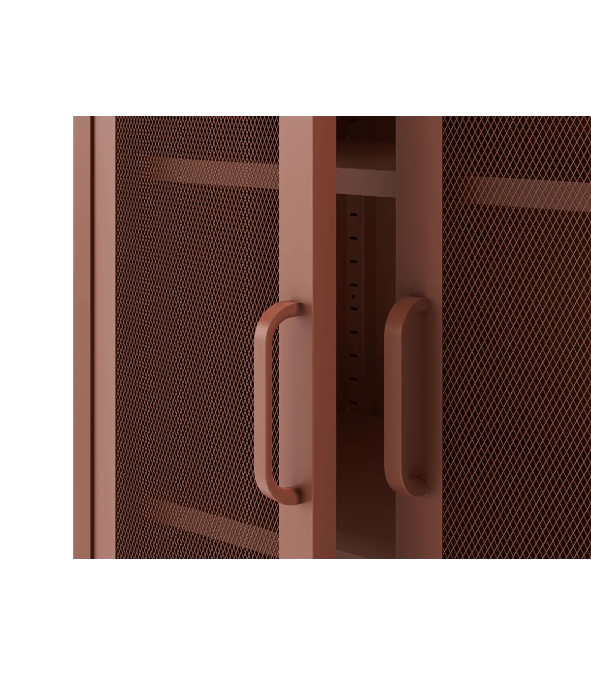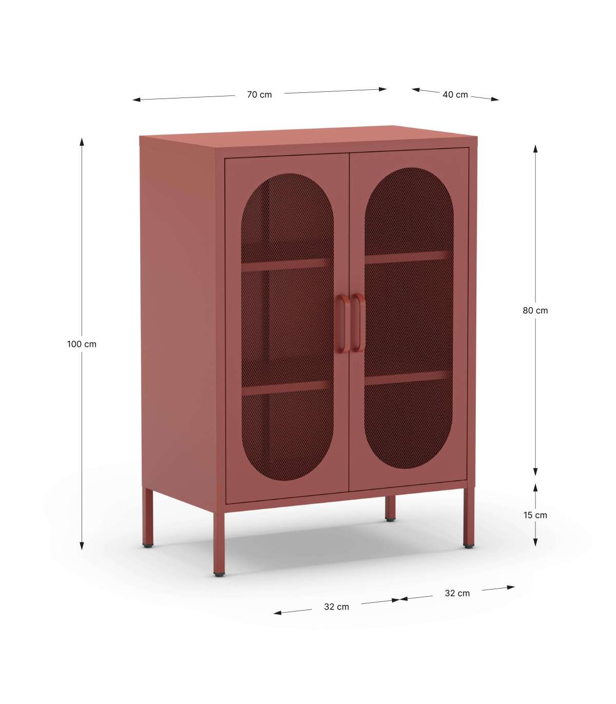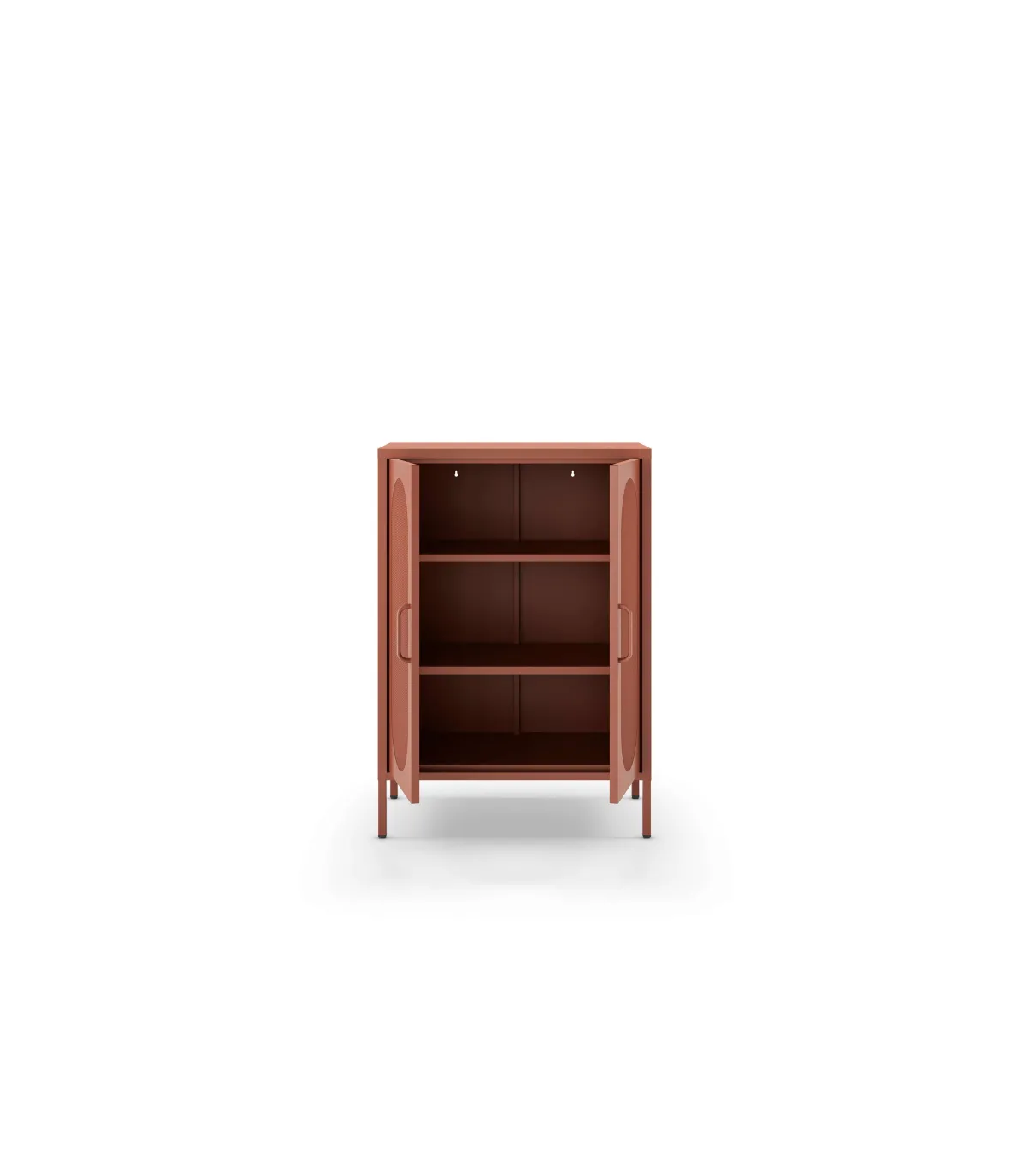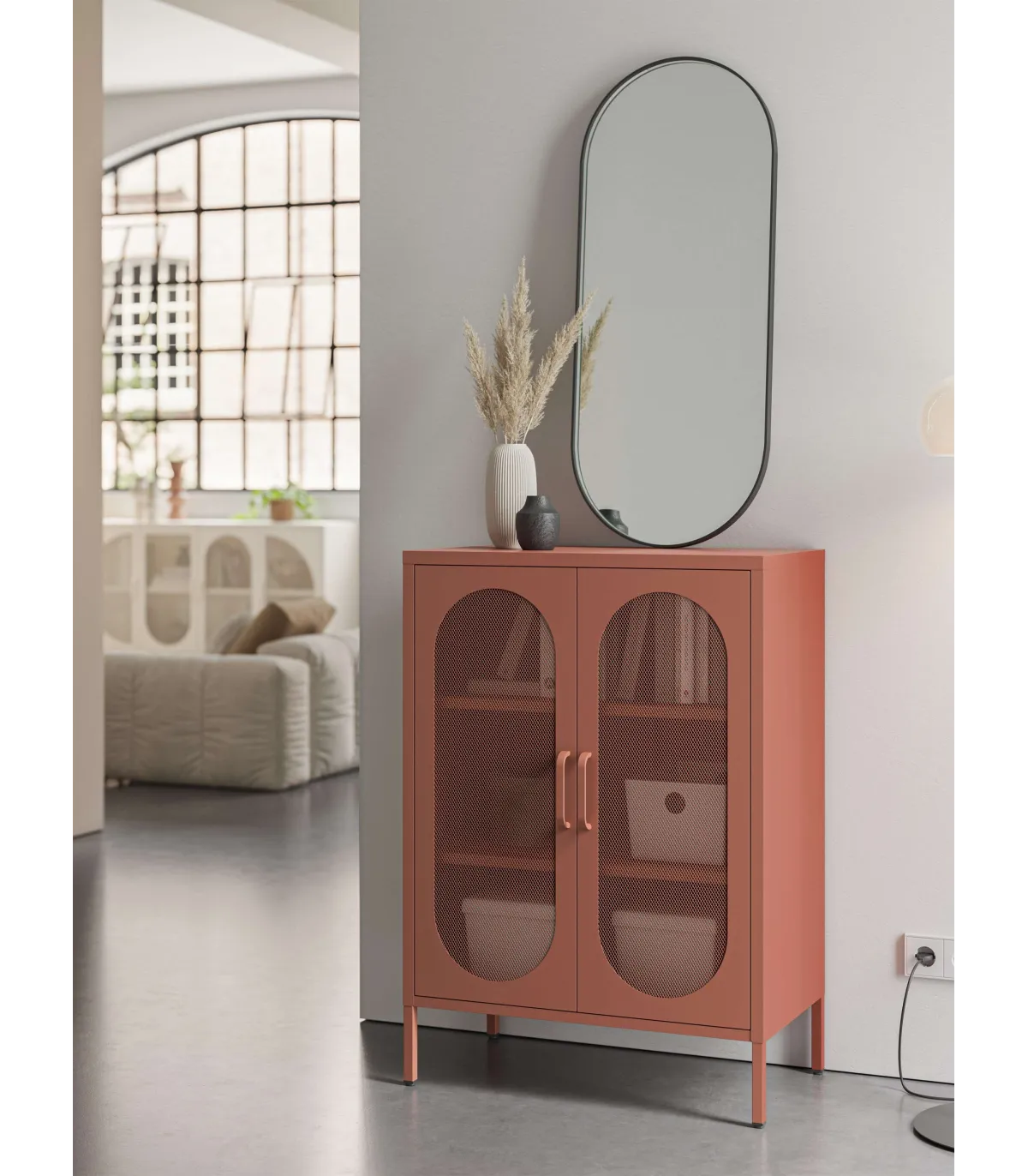 El mueble auxiliar Dora es la solución ideal para organizar tu espacio con estilo. Su diseño versátil con 2 puertas abatibles y dos estantes permite un almacenamiento eficiente, mientras que su acabado en metal terracota le otorga un toque moderno e industrial.