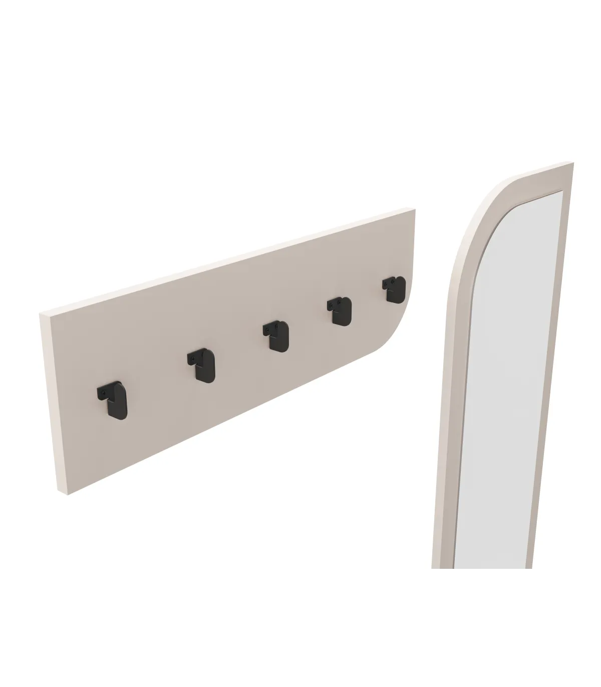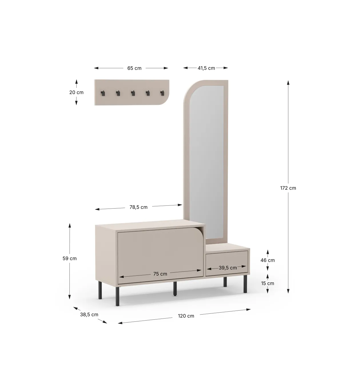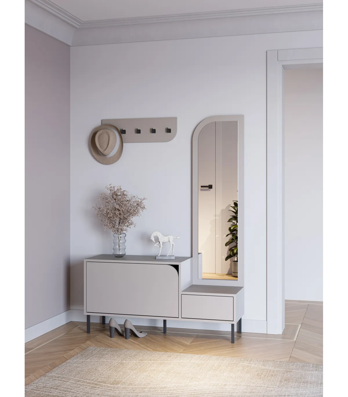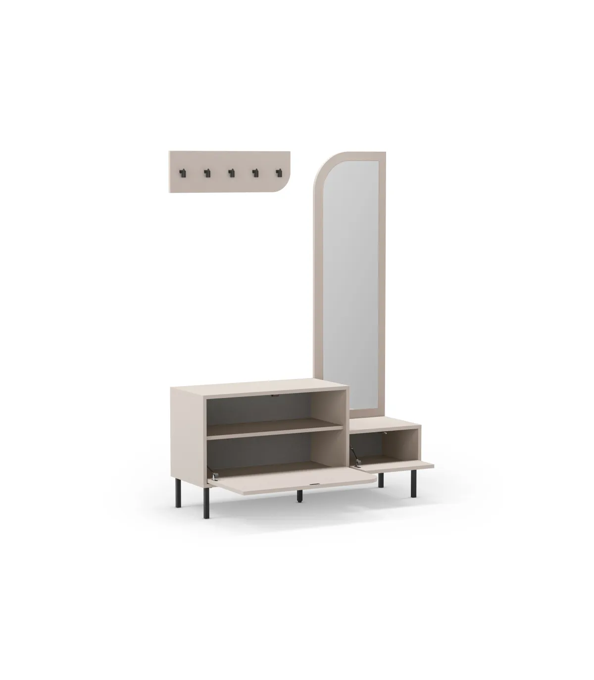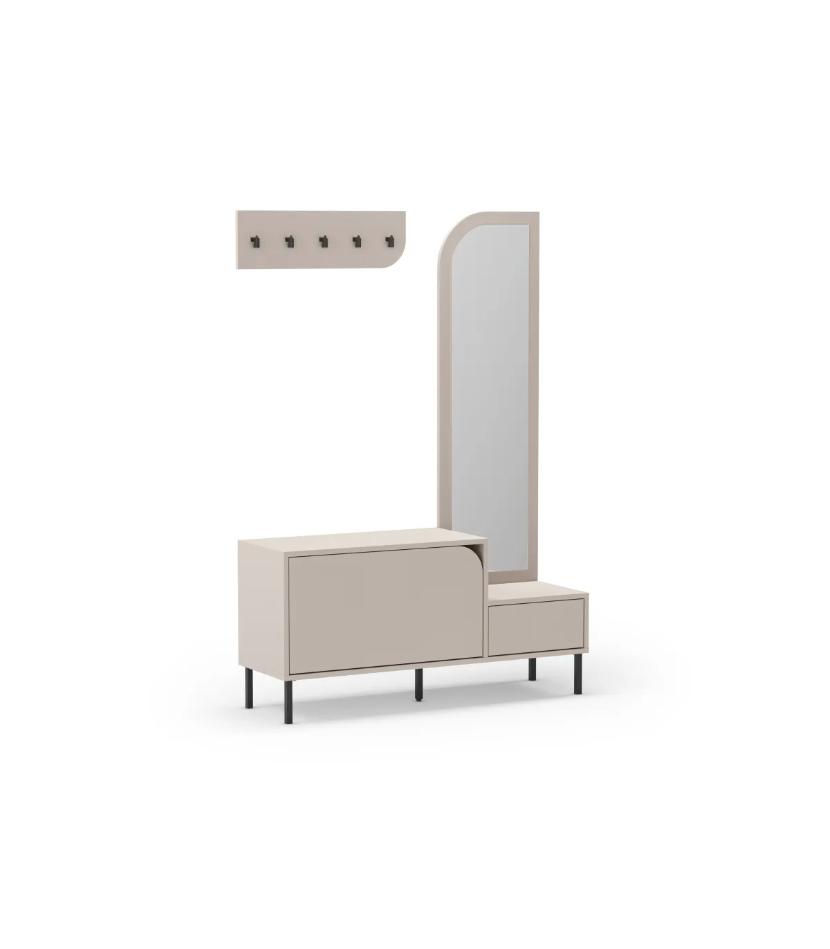 Conjunto de recibidor de estilo moderno que combina funcionalidad y diseño en un solo mueble. Incluye zapatero, perchero y espejo, todo integrado en una estructura compacta, ideal para entradas contemporáneas.