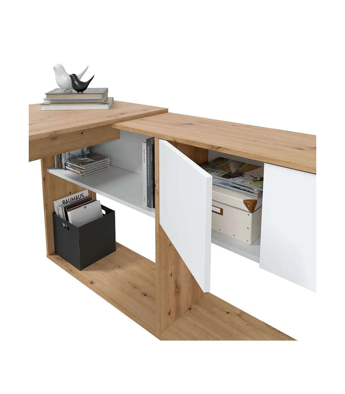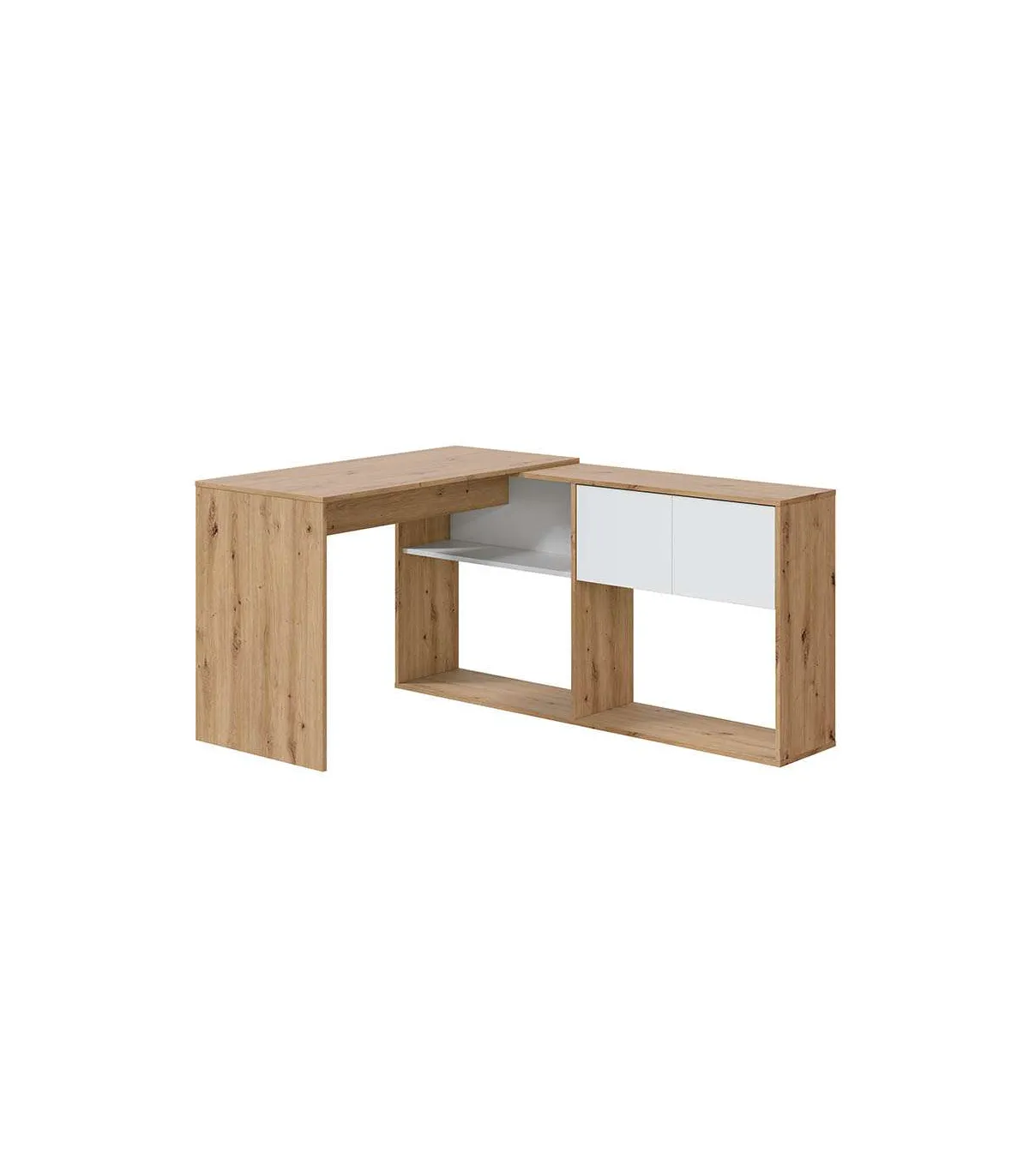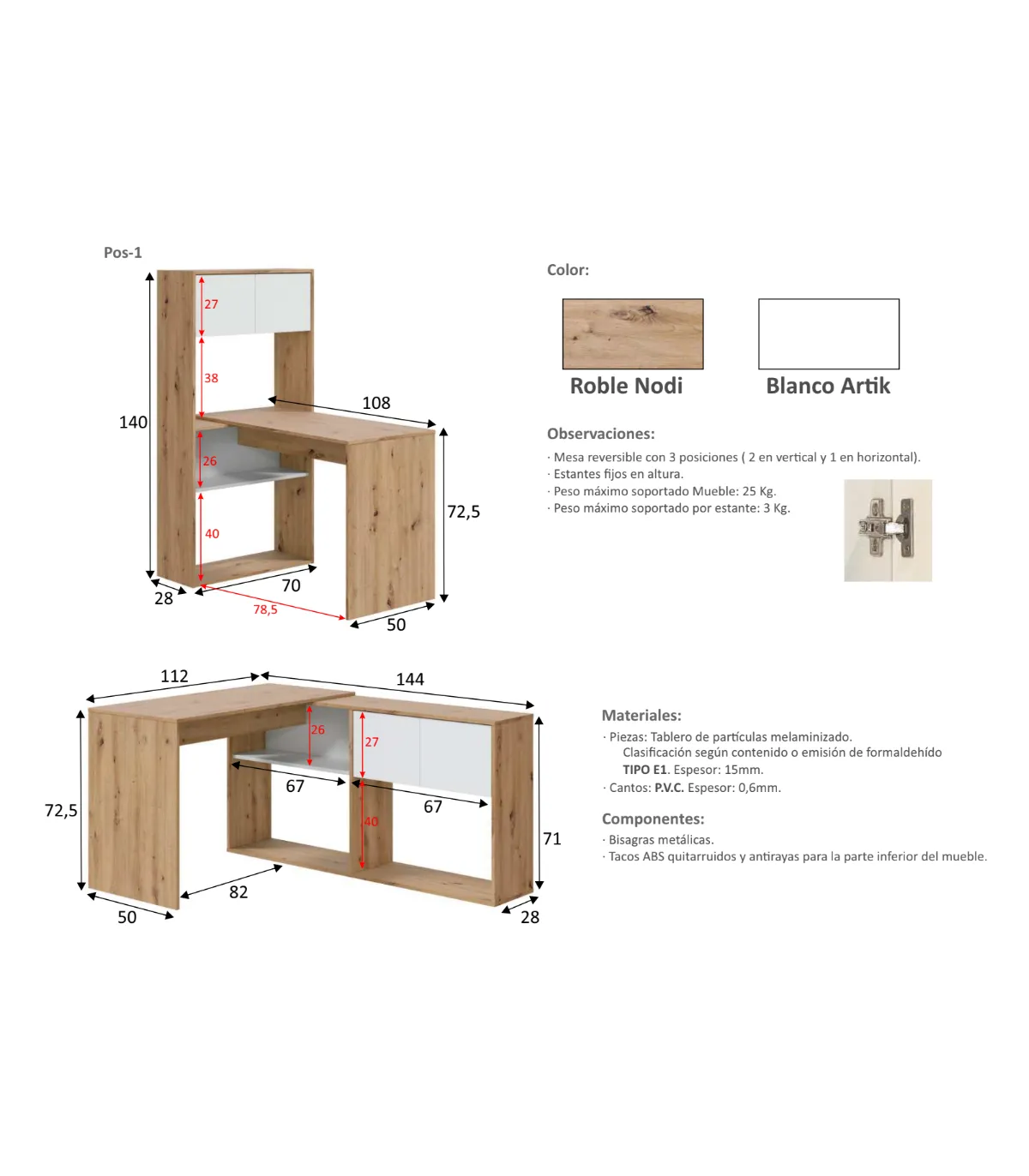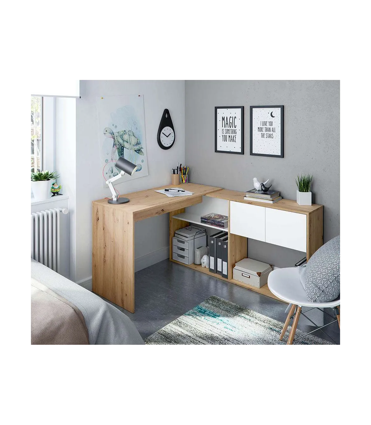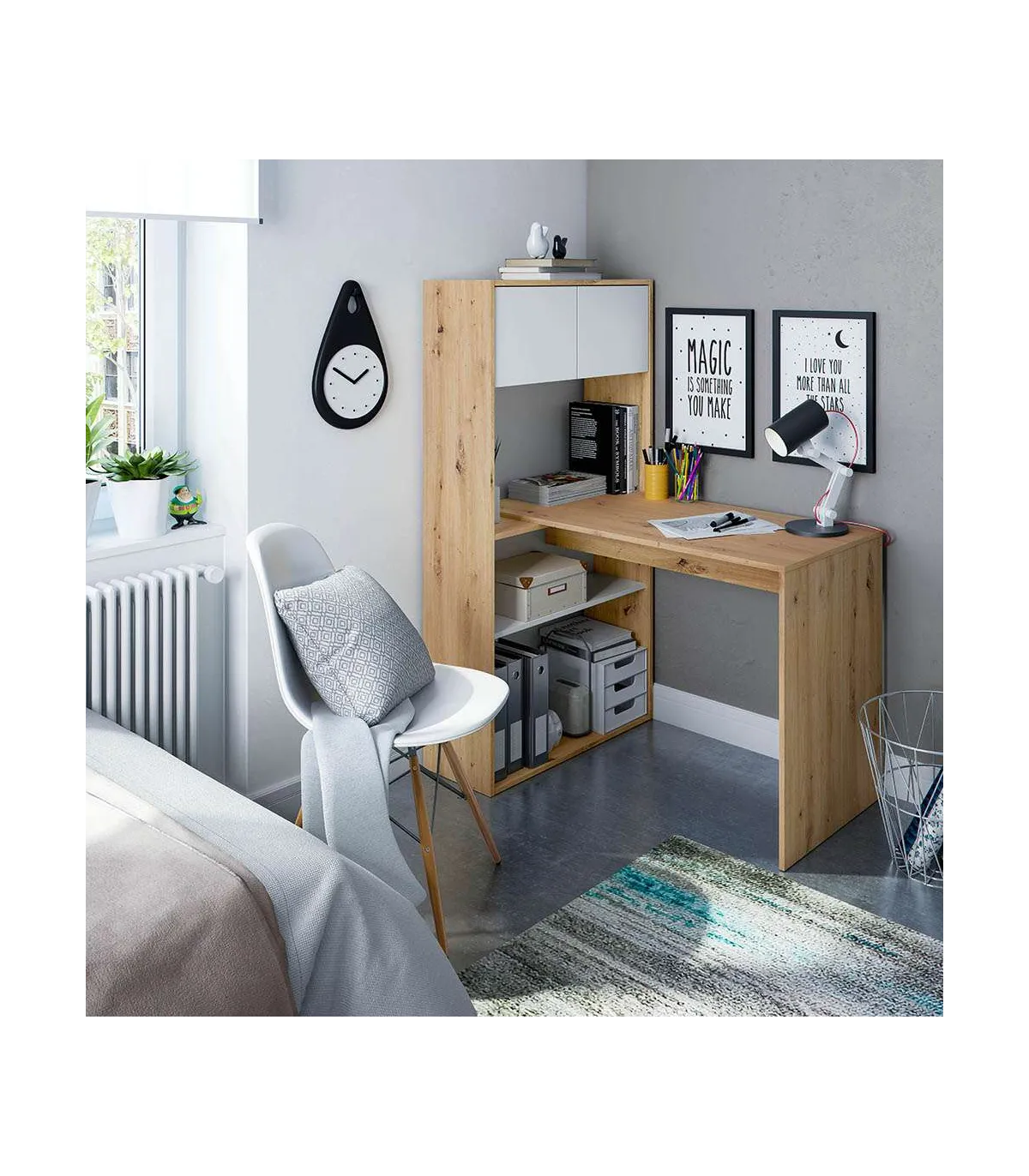 Escritorio con estantería reversible Gema en blanco artik y roble nordi 72,5 cm (alto) x 112 cm (ancho) x 144 cm (prof.)