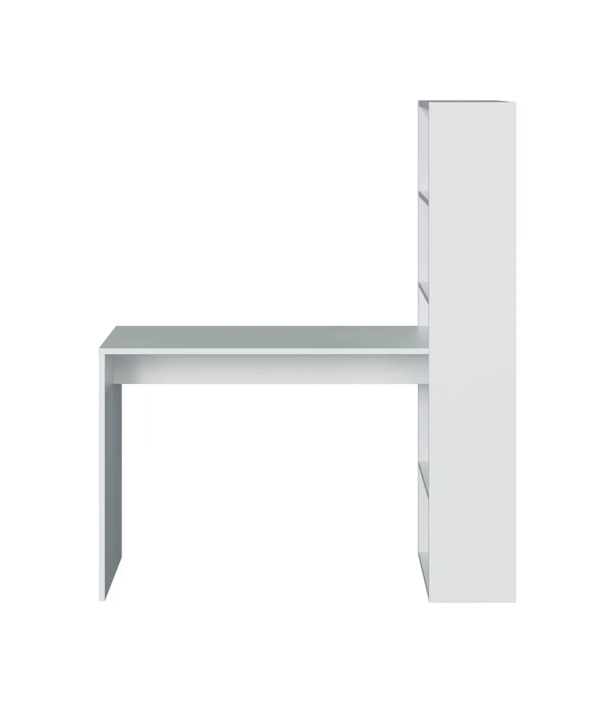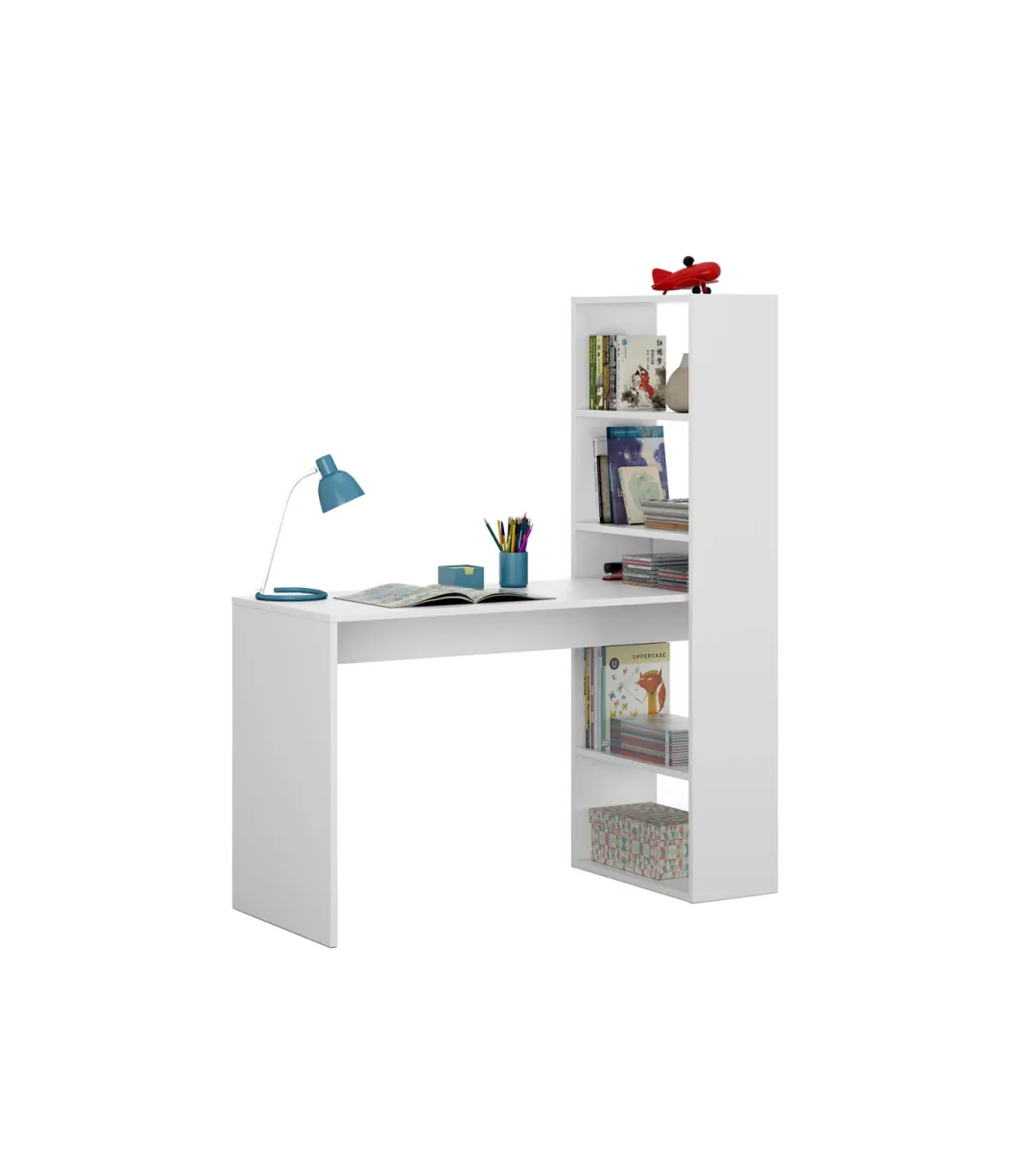 Mesa escritorio reversible con estantería sencilla, práctica y económica. Con 5 huecos para organizar libros, cuadernos o decoración, es perfecto para estudiar, trabajar o crear tu rincón de oficina. Fabricada en color blanco.