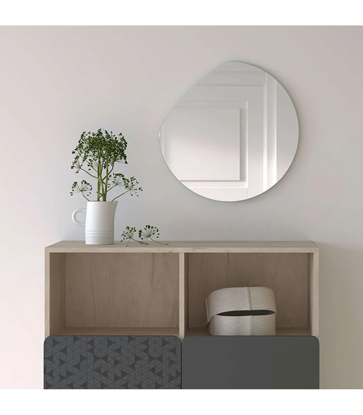 Espejo de pared en líneas redondeadas con forma asimétrica y diseño moderno. Si quieres dar un toque diferente en la entrada, el salón o incluso el dormitorio, este espejo será la mejor opción gracias a su sencillez y originalidad. Además, la parte trasera y los bordes de MDF.
