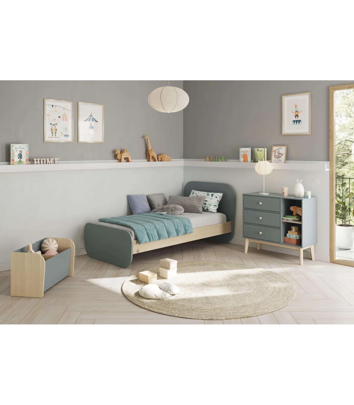 La cama juvenil es un práctico y elegante mueble fabricado en madera DM lacada y Pino natural, con un acabado de cera blanca combinado con verde kaki. Esta cama ofrece una solución versátil para espacios reducidos, Su diseño y acabado le dan un toque moderno y atractivo, perfecto para habitaciones juveniles con estilo.