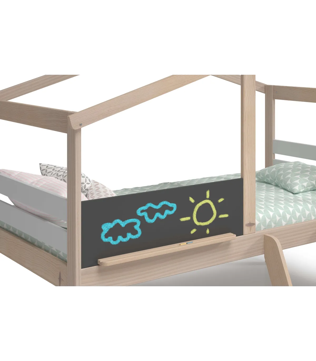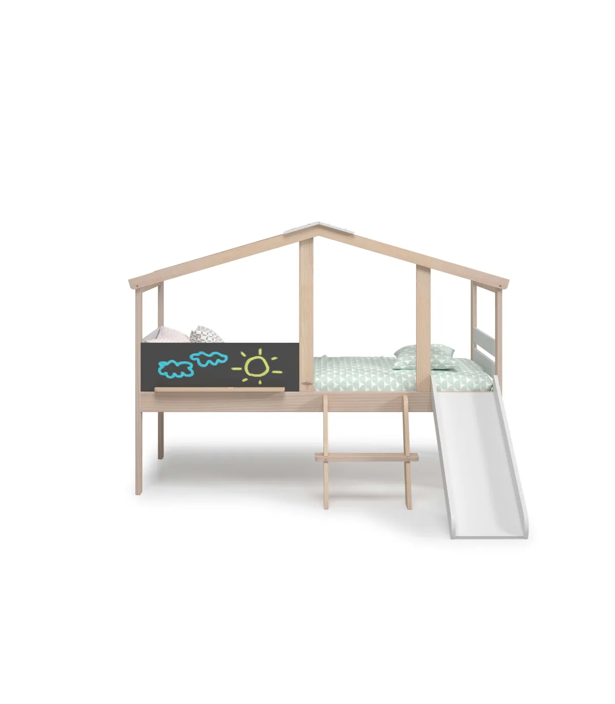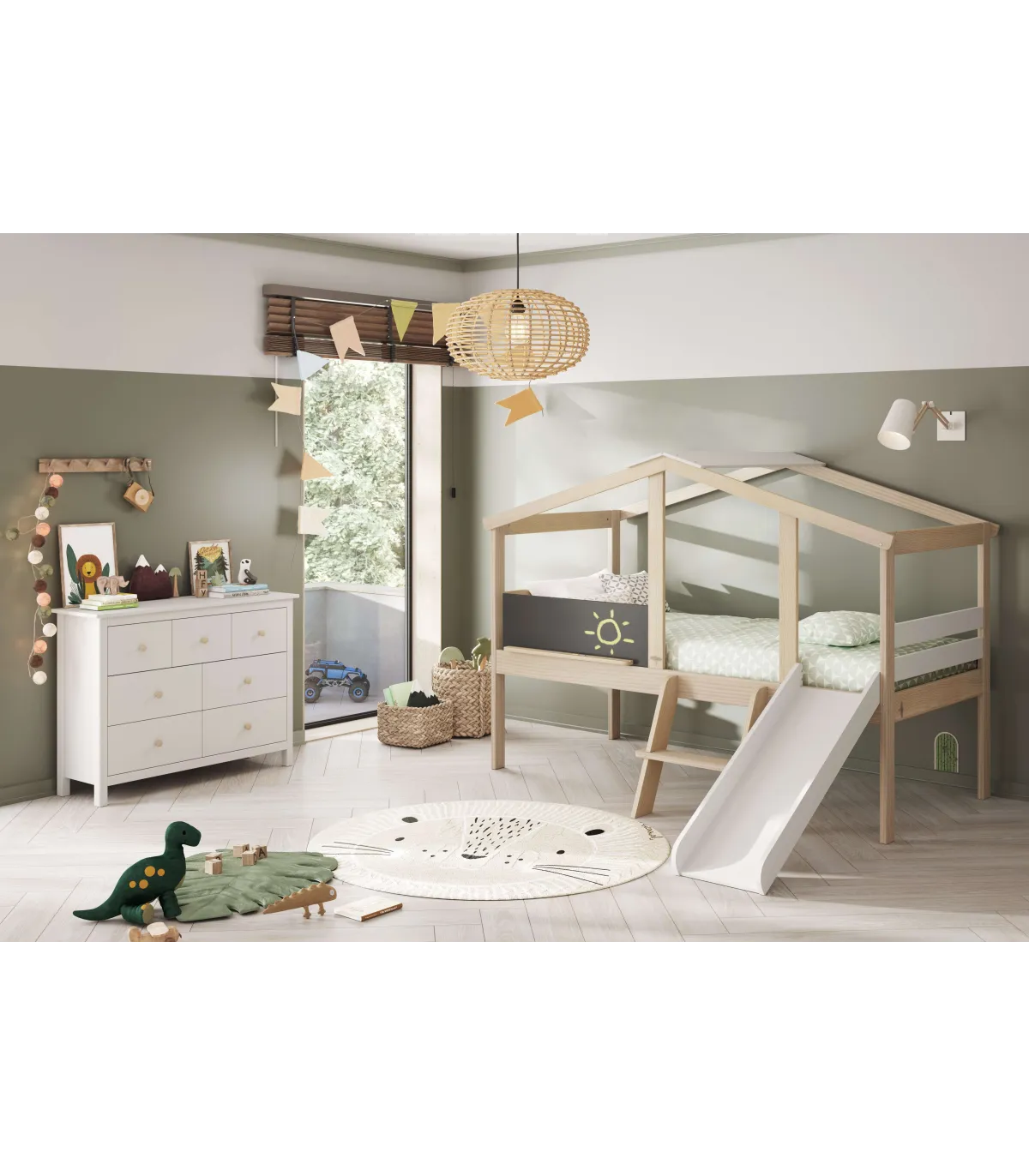 La cama infantil presenta un diseño diferente y único en forma de casita, en DM/PINO tintada en tonos blancos que le confieren un aspecto natural.