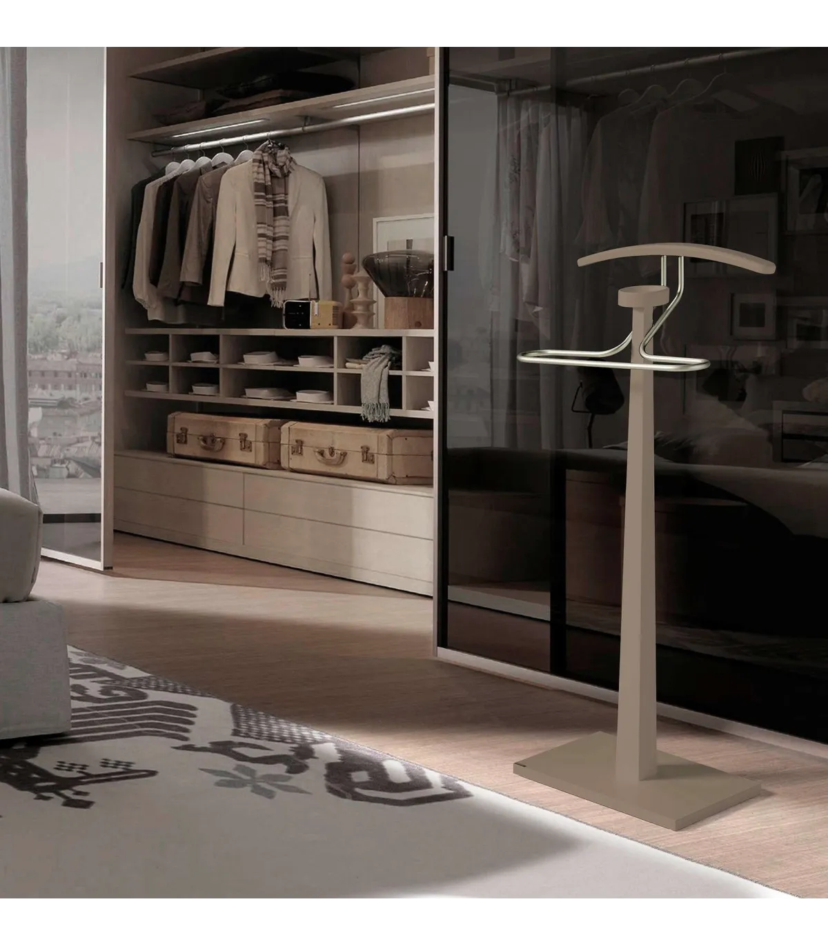 Funcional galán fabricado en madera de haya lacada en moka con terminaciones en hierro cromado.