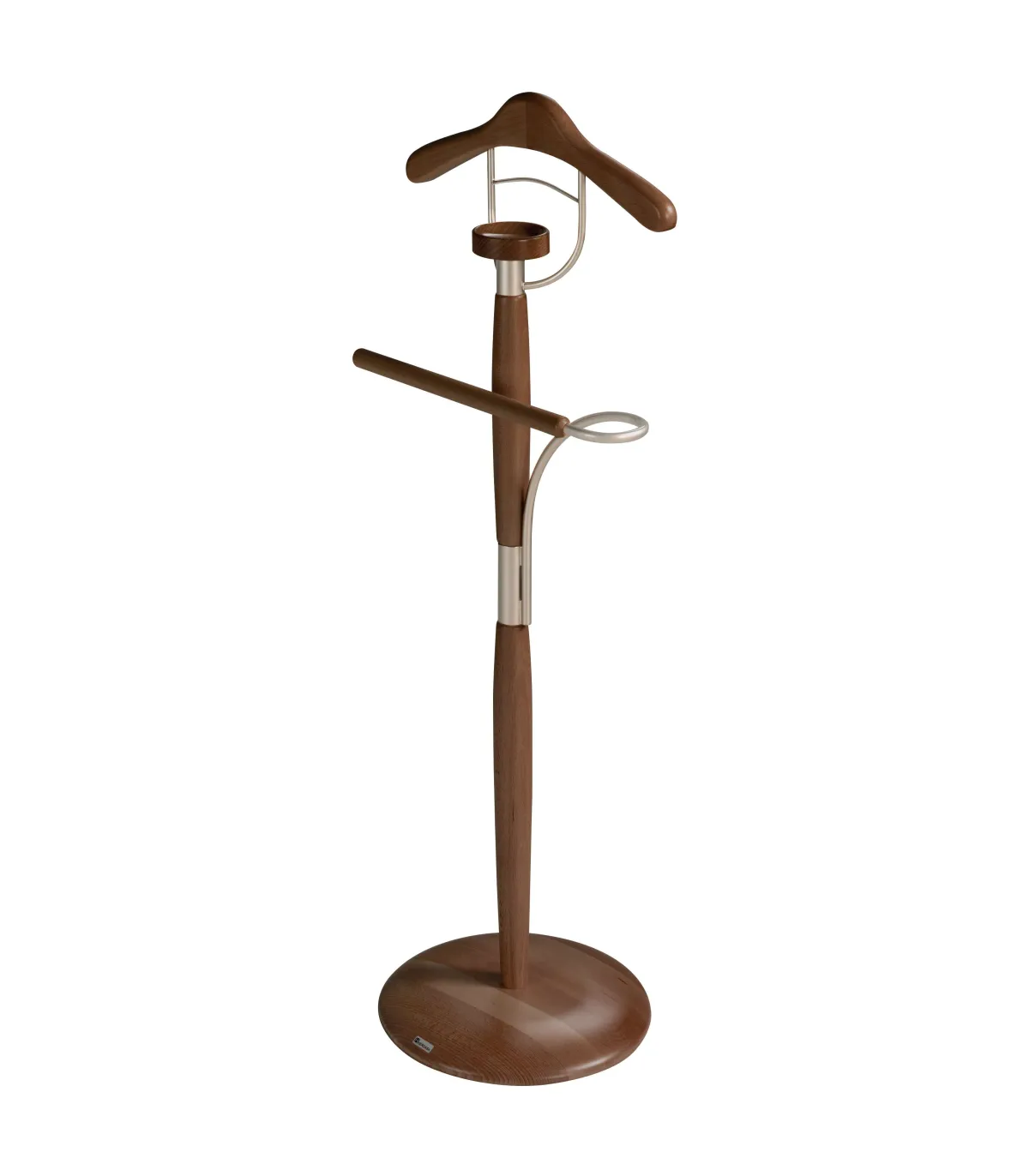El galán que describes es un elegante y exclusivo accesorio fabricado con madera noble de haya lacada en nogal y herrajes en cromo satinado. Este galán cuenta con un acabado de primera calidad tanto en el barnizado como en el lacado, lo que le proporciona una apariencia sofisticada y duradera. Además de ser funcional para colgar ropa y complementos en dormitorios y vestidores, este galán también destaca por su diseño decorativo, que añade un toque de estilo a cualquier espacio.