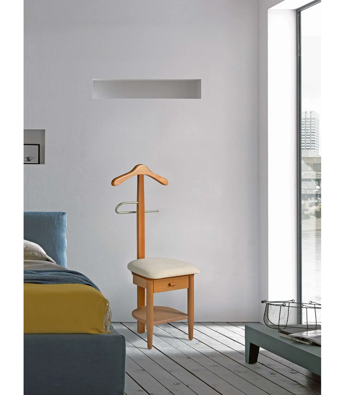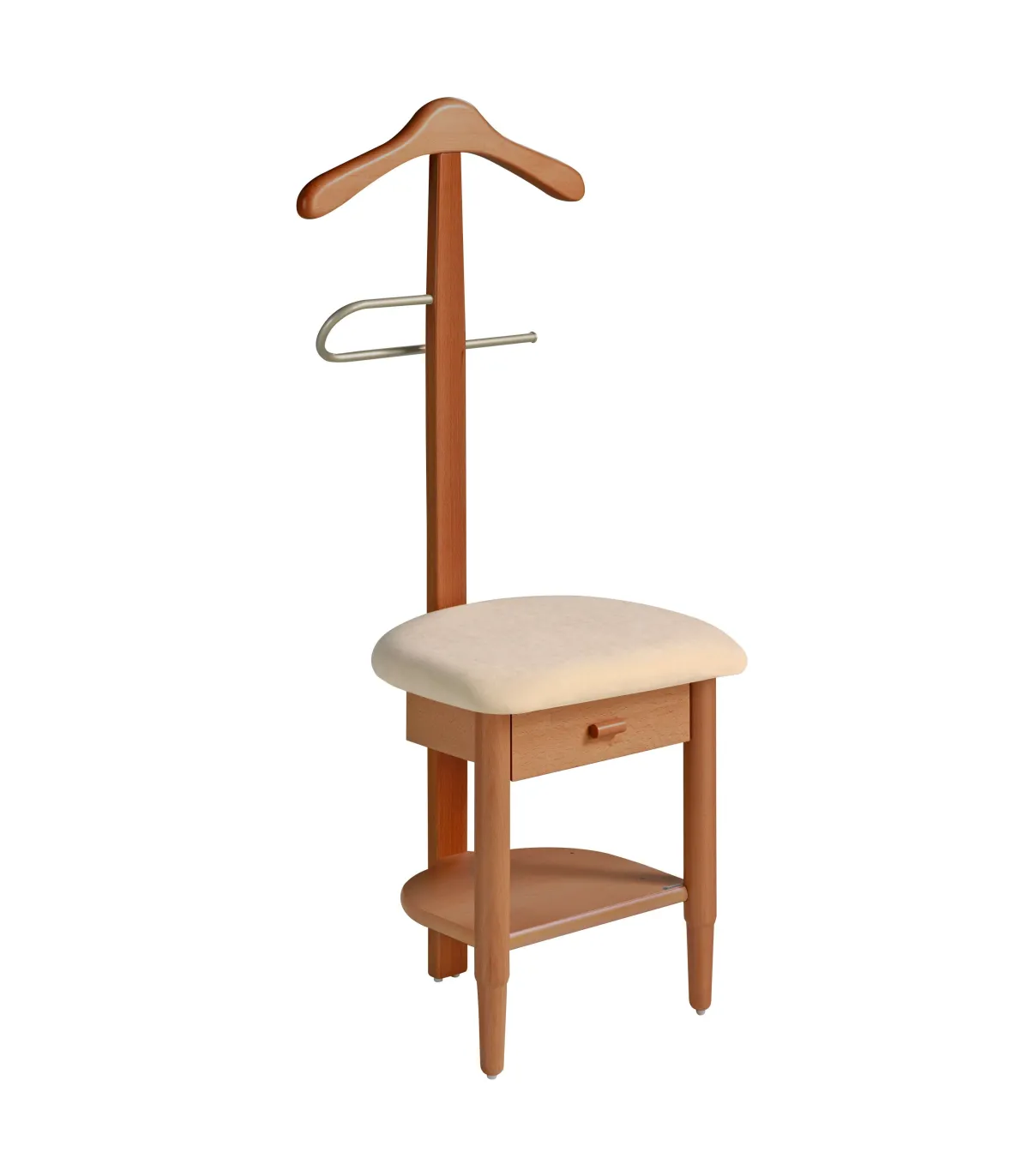 La silla-galán de noche fabricada en madera de haya lacada es un mueble elegante y funcional. Cuenta con una percha curvada para colgar ropa, así como una amplia pantalonera cromada. Además, tiene un cajón y un estante debajo del asiento, que ofrecen espacio adicional de almacenamiento. Este producto combina estilo y utilidad, siendo ideal para organizar y mantener la ropa en orden durante la noche.