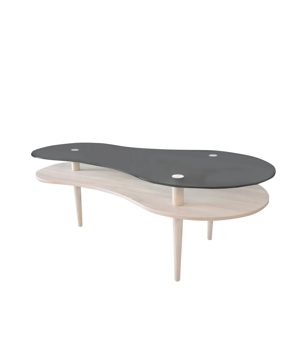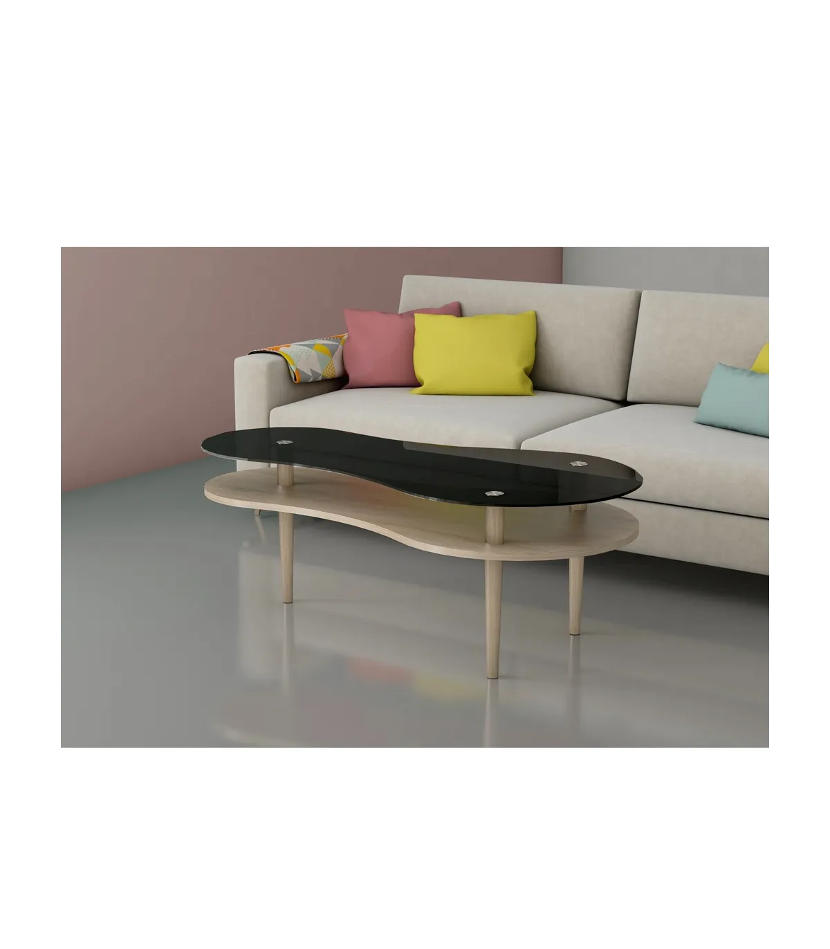 La Mesa de Centro modelo Peanut combina la belleza del cristal negro, con la calidez de las patas madera de haya, creando una pieza elegante y funcional para tu sala de estar.