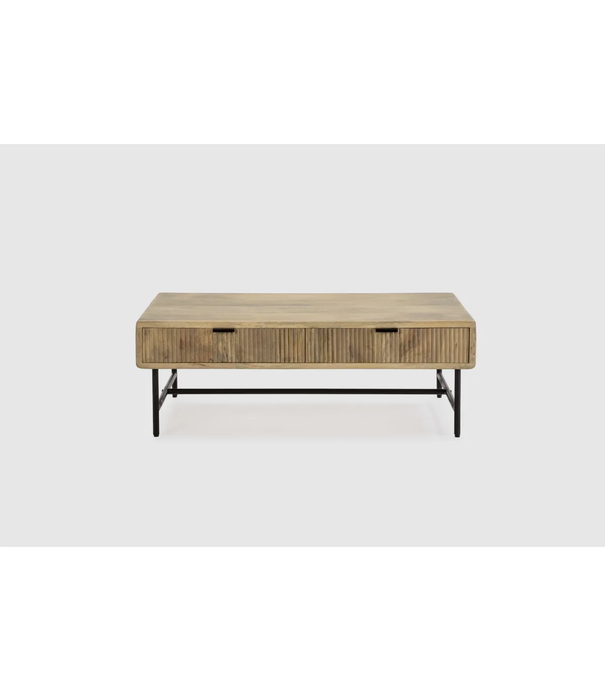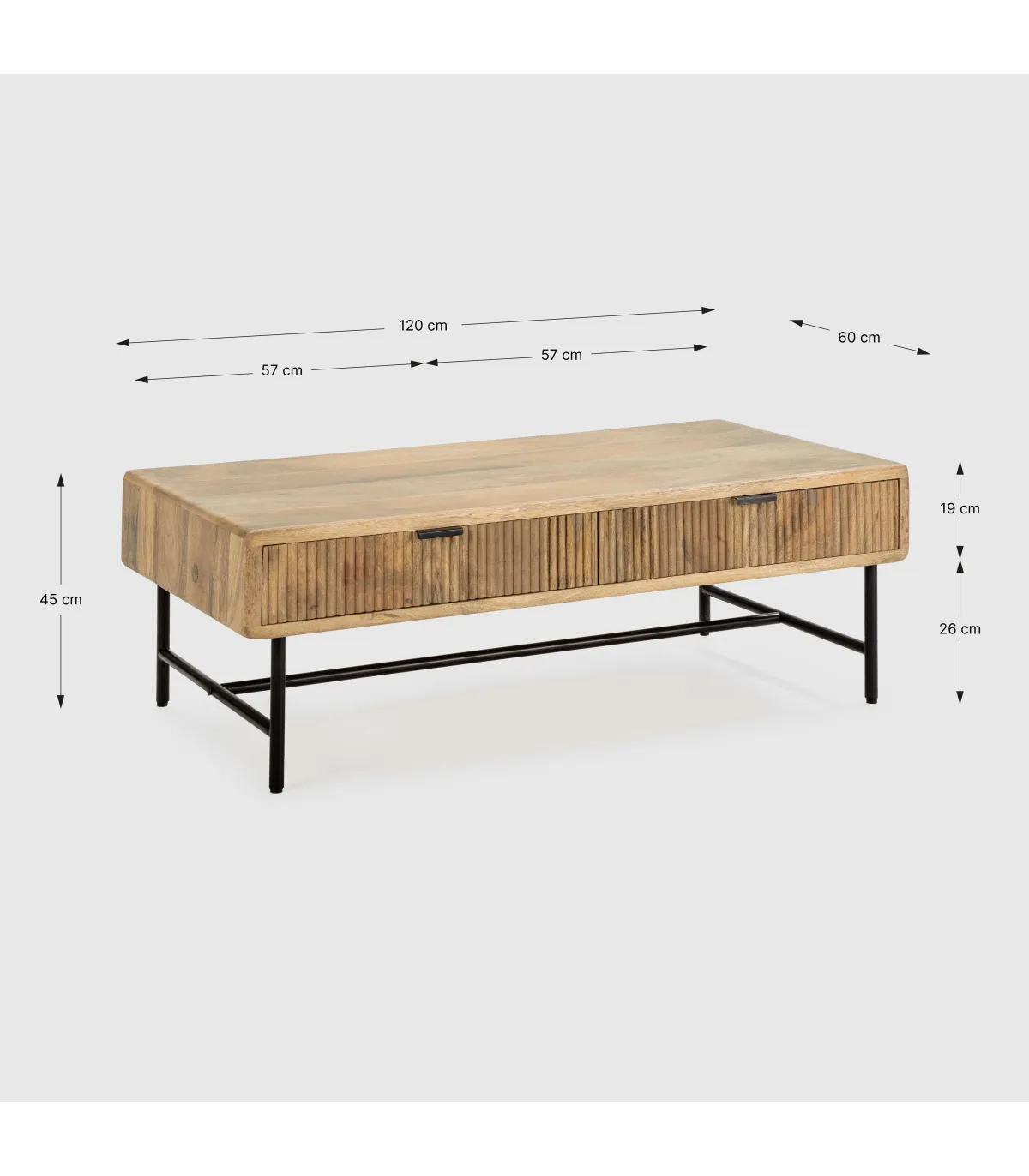 Transforma tu sala con la elegante Mesa de centro Michel de madera de mango · 45cm alto · 120cm ancho · 60cm fondo.