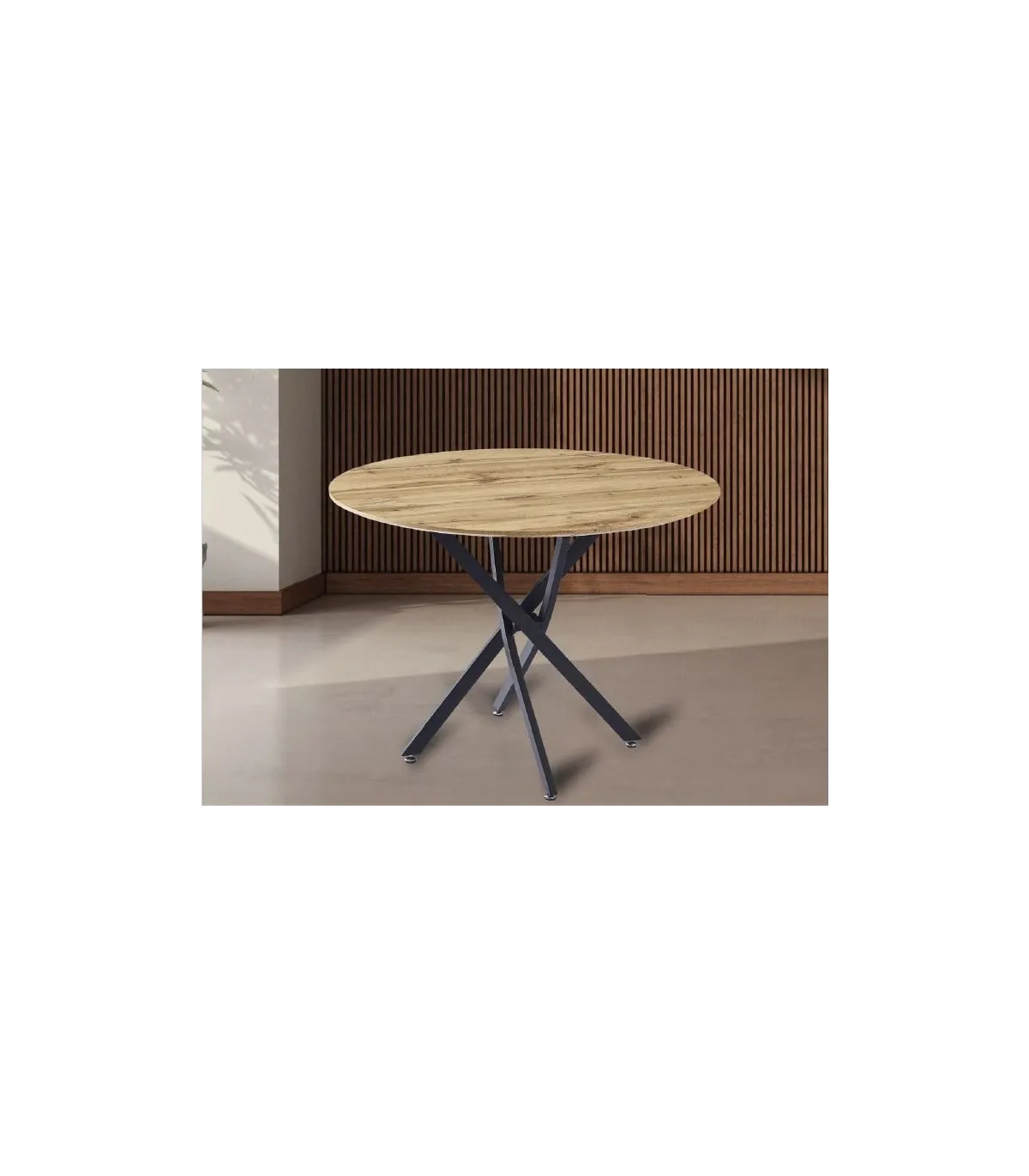 Disfruta de momentos únicos con la mesa redonda Nesy, elegante y funcional · tapa efecto madera · patas metálicas resistentes.