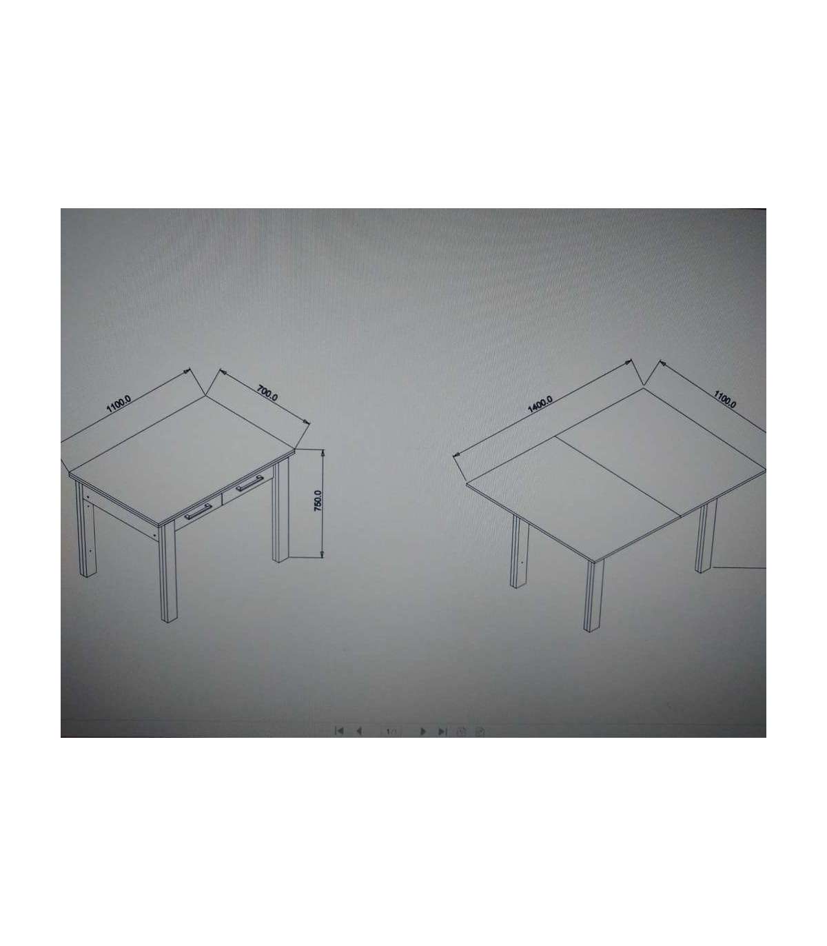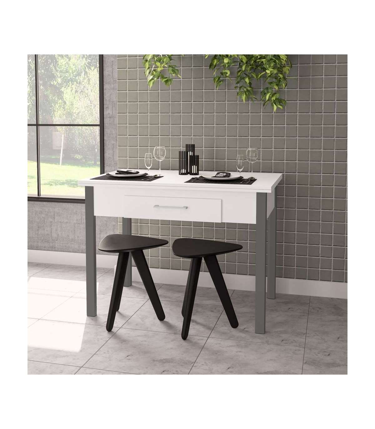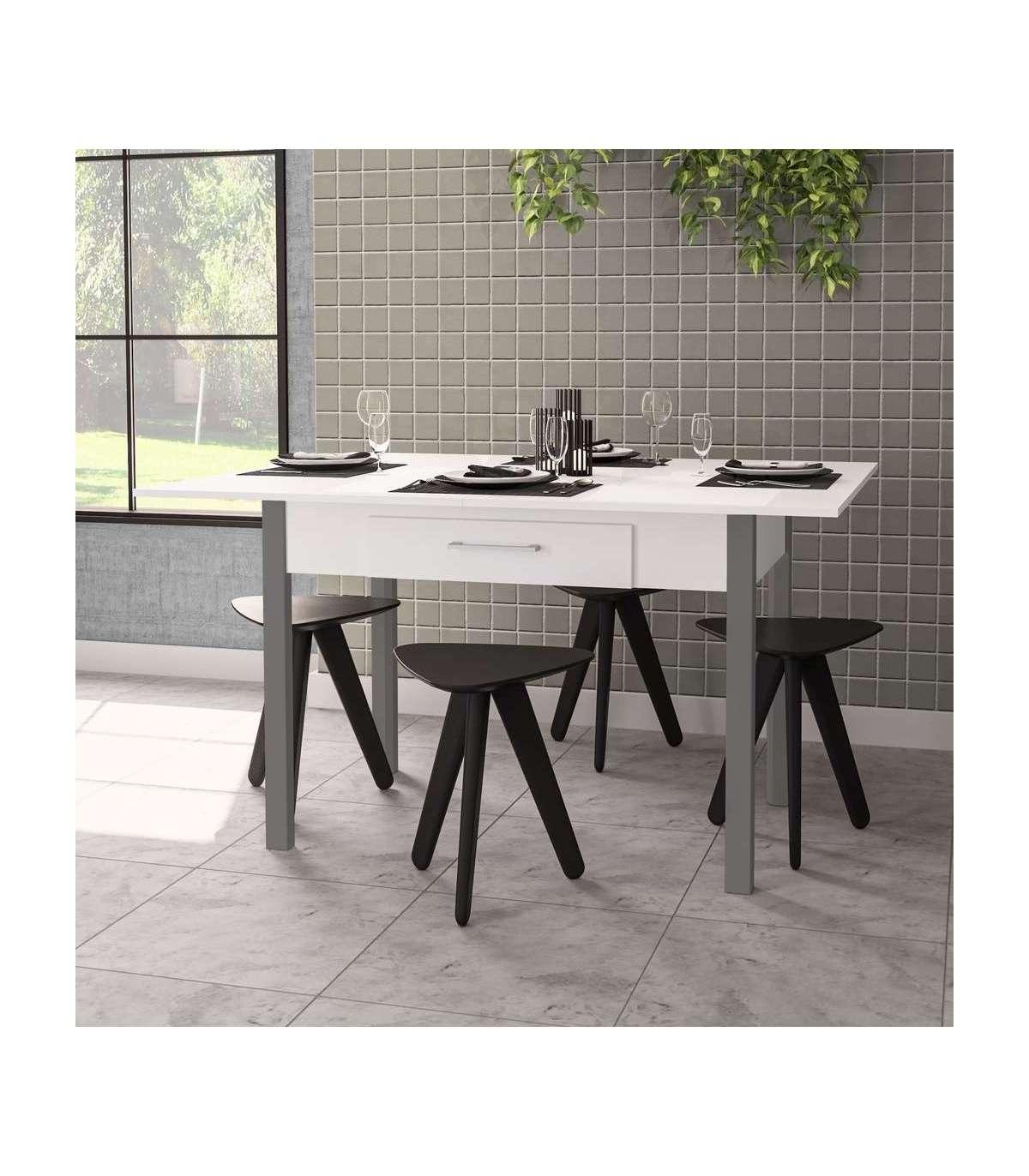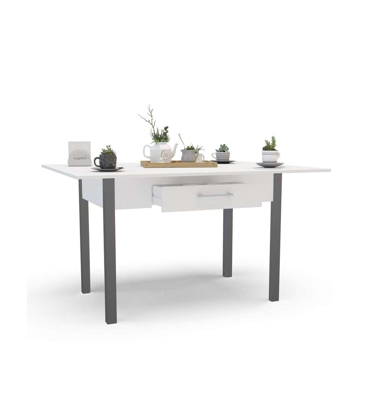 Mesa para cocina, comedor abatible 2 cajones Md-Bety acabado blanco/gris, 110/140cm(ancho) 75cm(altura) 70cm(fondo).