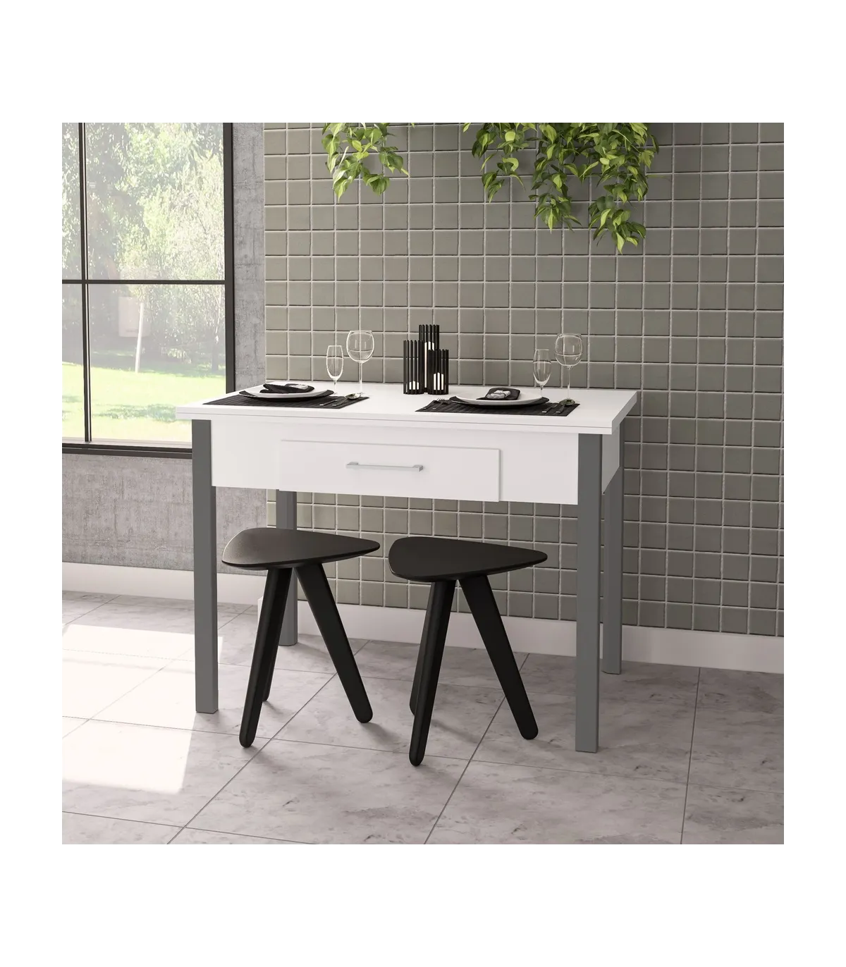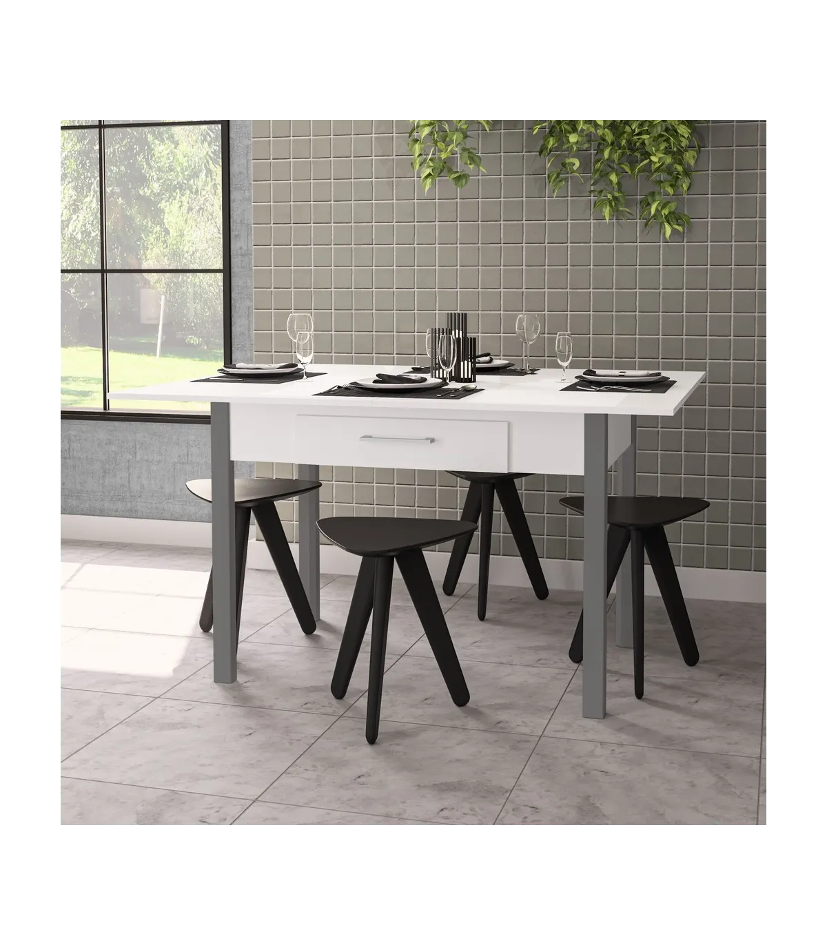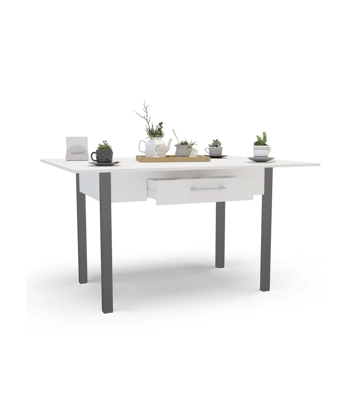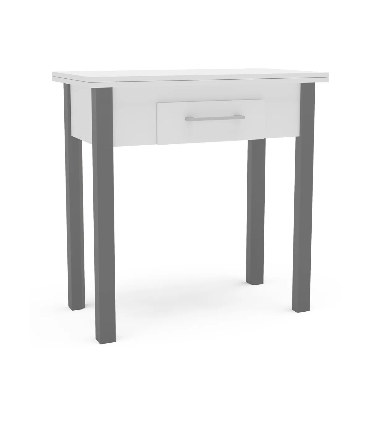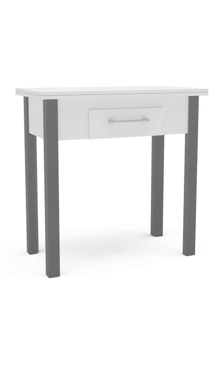 Optimiza tu espacio con la mesa abatible Md-Bety, ideal para cualquier ocasión · 2 cajones · acabado en blanco/gris.