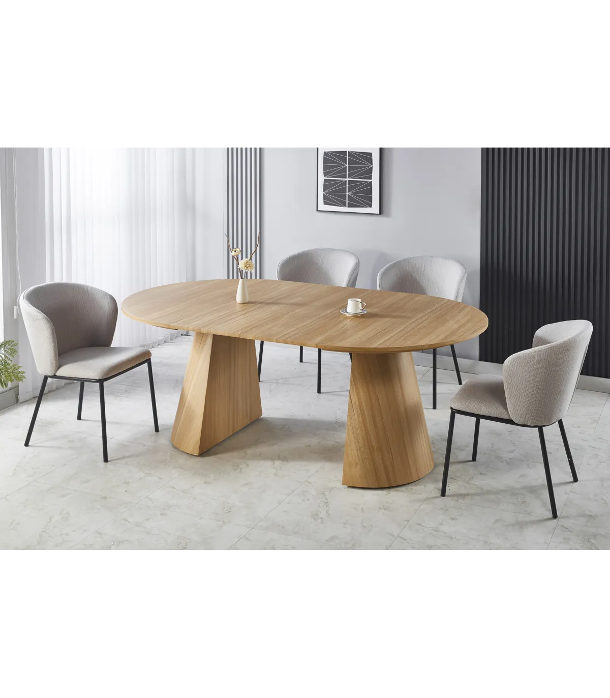 La mesa de comedor extensible Damiano combina funcionalidad y diseño nórdico para adaptarse a cualquier espacio. Su estructura está fabricada en MDF y papel laminado , ofreciendo un acabado cálido y elegante. Las patas cónicas aportan estabilidad y un toque distintivo.
