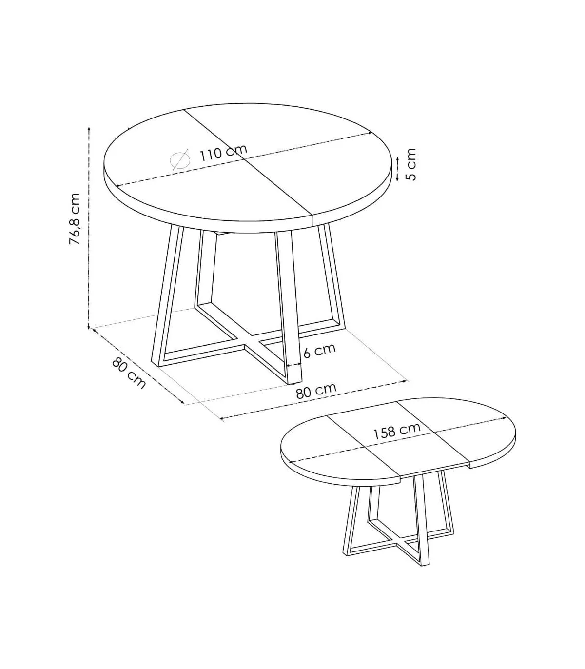 Dimensiones: ↕ 77 cm ↔ 110-158 cm ↗ 110 cm