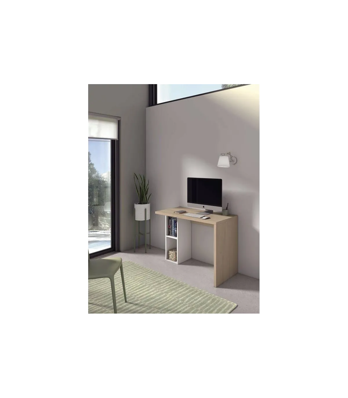 Escritorio formado por una encimera rectangular, con caída, en cascada por su parte, derecha, y con una estantería inferior como apoyo, en la parte izquierda. Se ha fabricado en melamina de primera calidad con acabado en color roble/blanco. Su amplia zona de trabajo y la estantería inferior para libros, documentos...