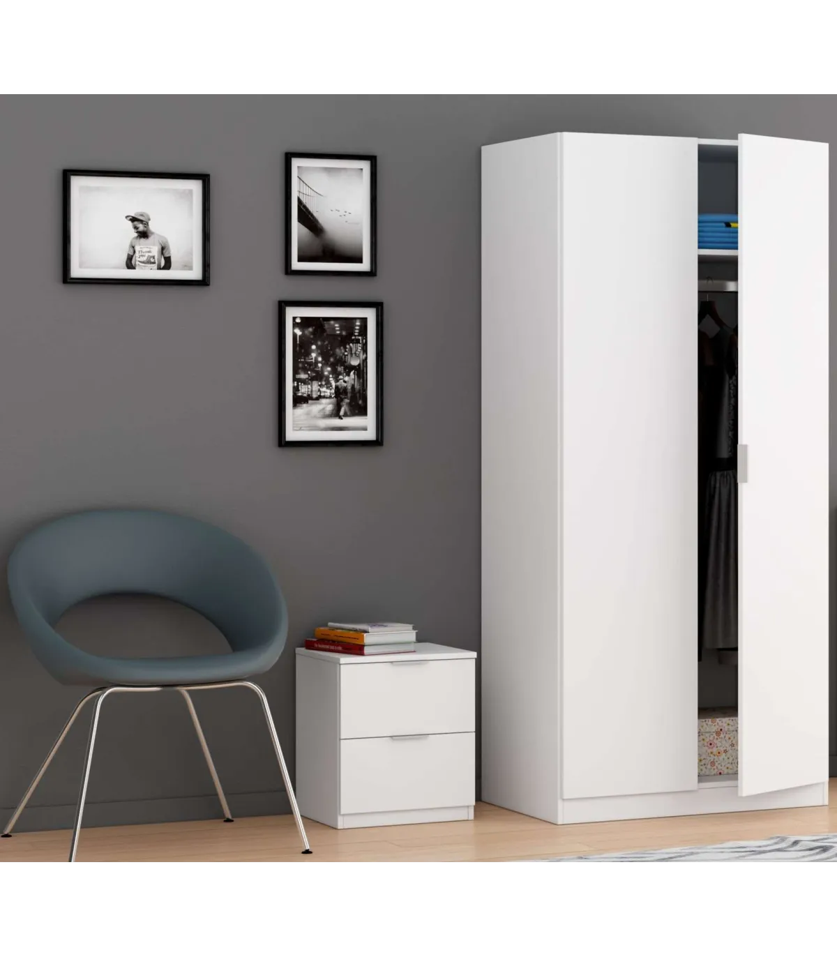Organiza tu espacio con estilo gracias a esta mesita de noche de hierro · 2 cajones · acabado roble o blanco.