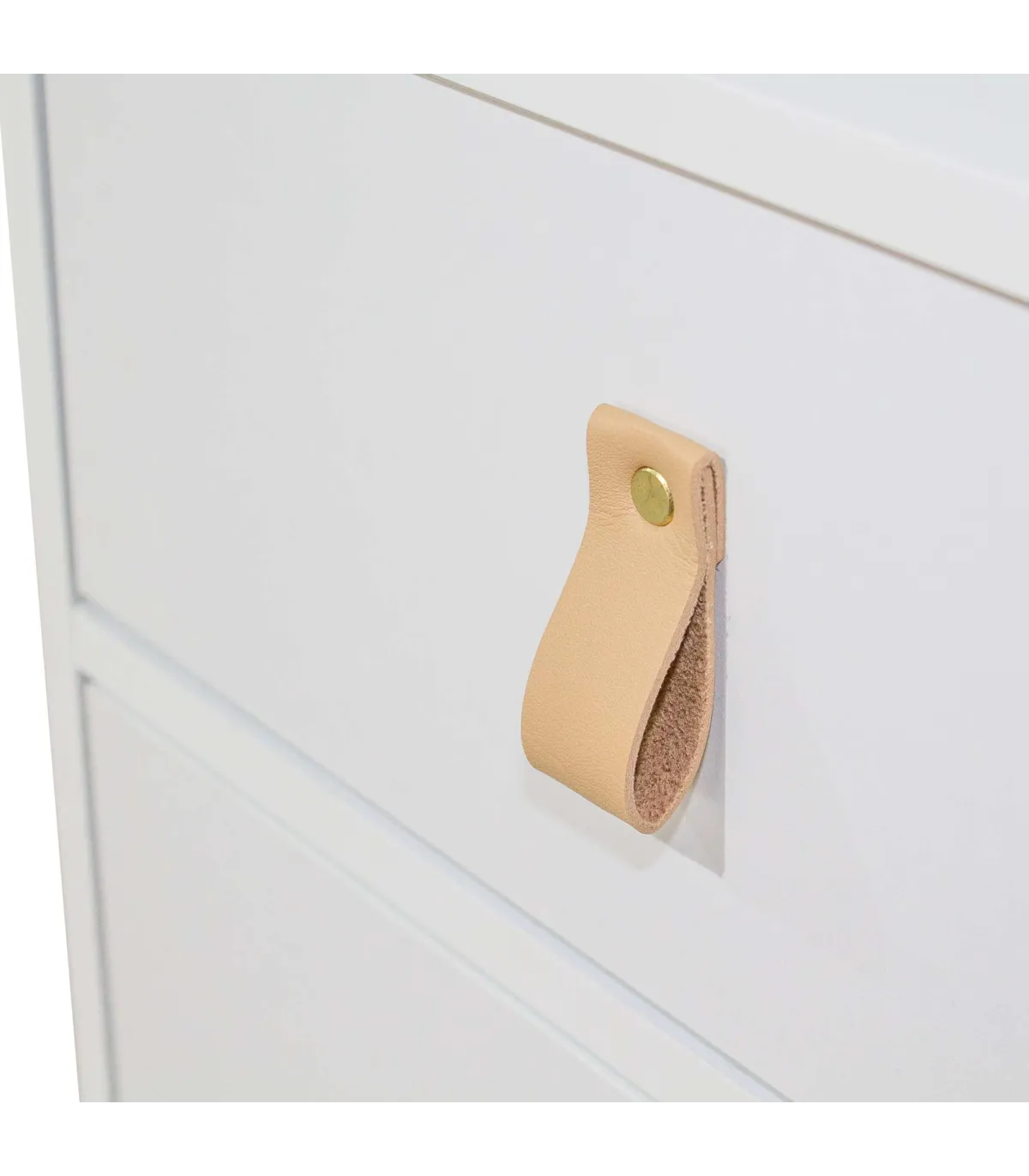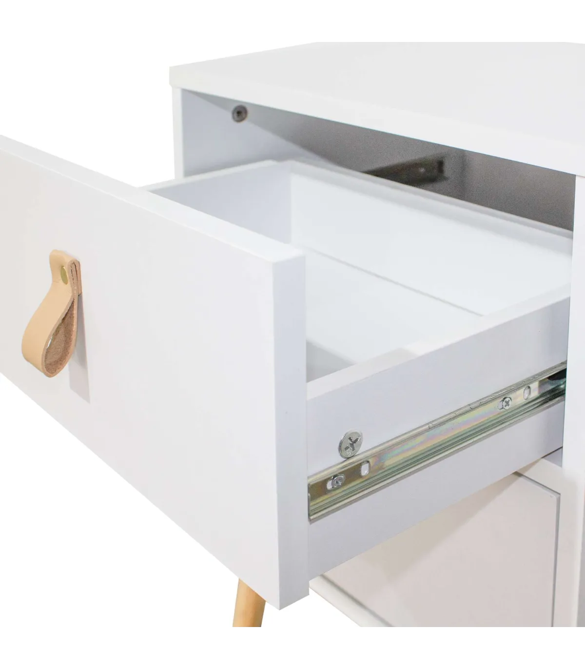 Las patas de la mesita de noche están fabricadas en madera de pino y han sido barnizadas, lo que aporta un toque natural y cálido al diseño. El tirador de los cajones está fabricado en poliuretano con apariencia similar al cuero, lo que le confiere un aspecto sofisticado y agradable al tacto.