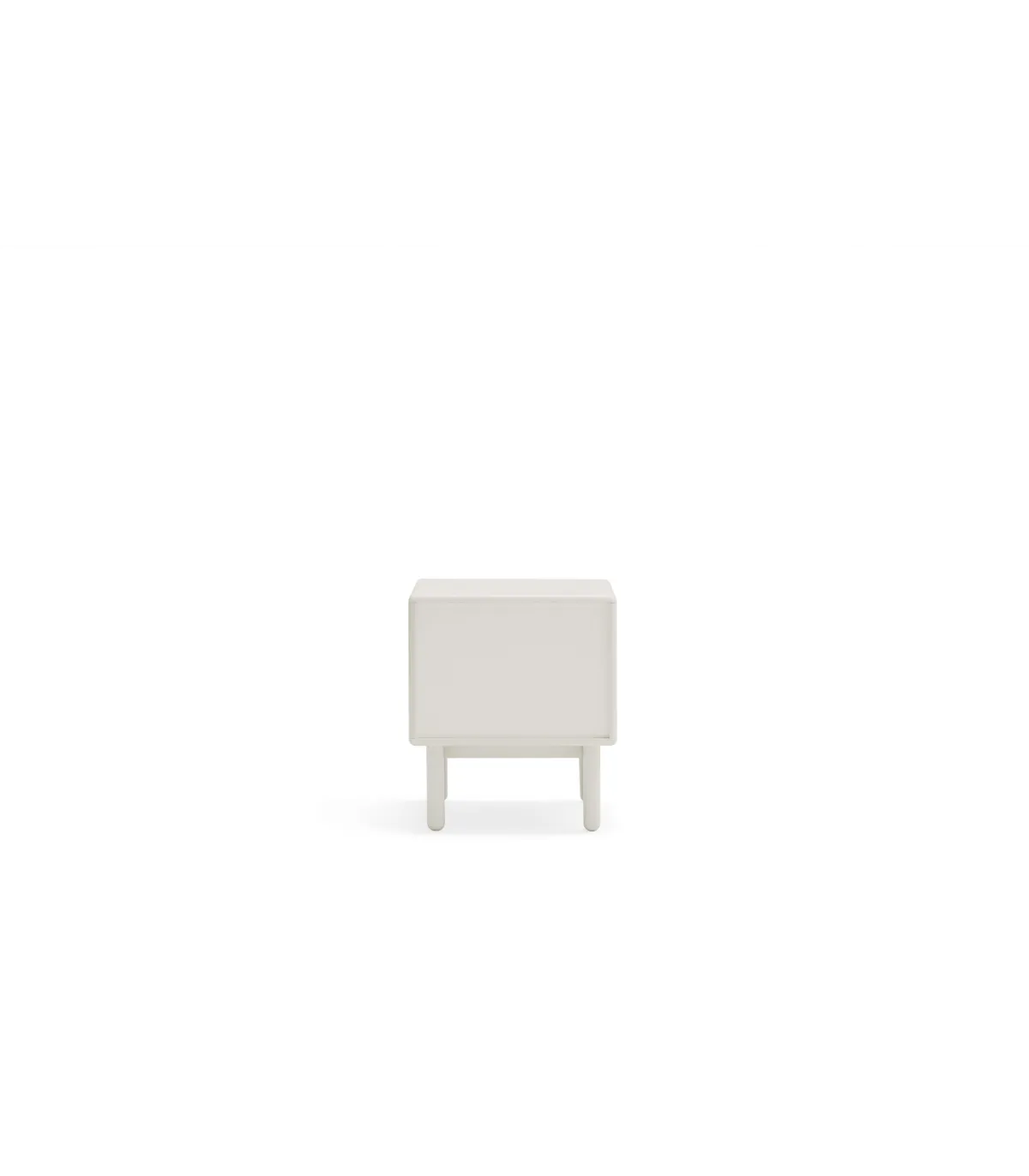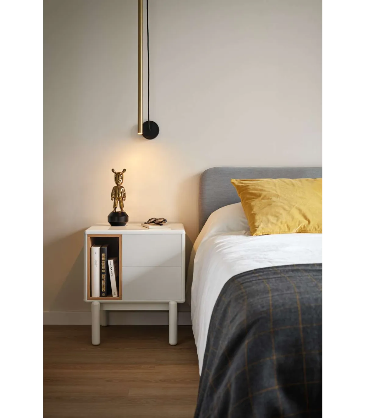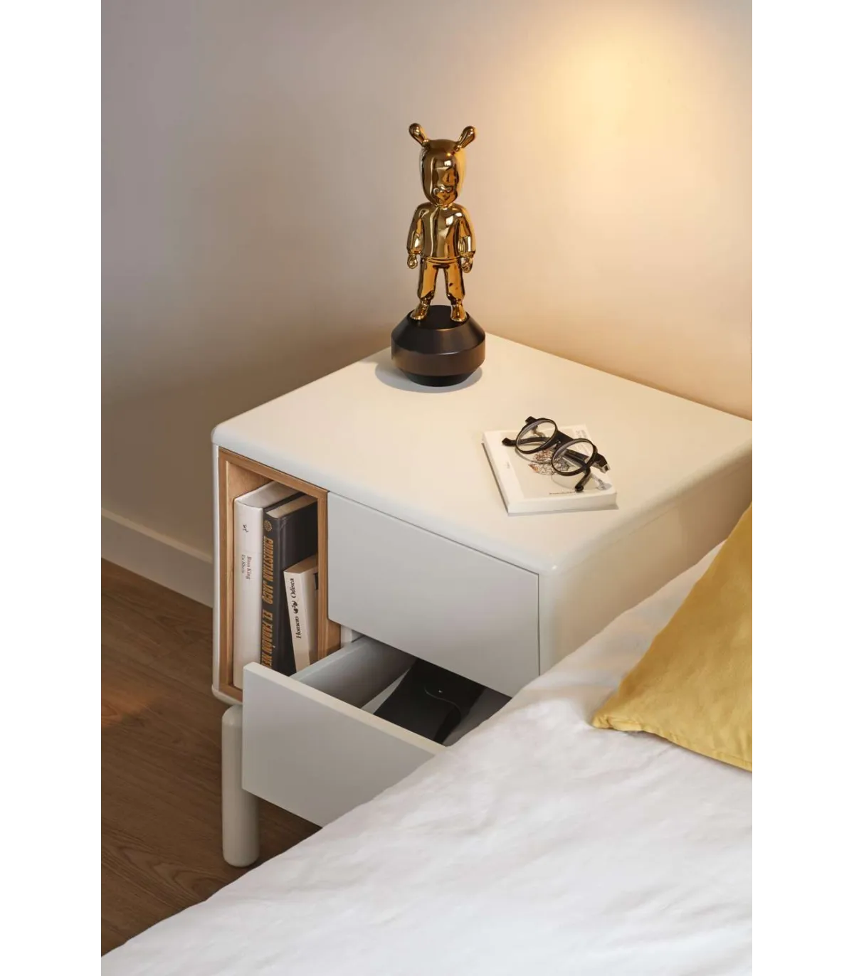Mesita de noche para dormitorio modelo Corvo, está fabricado en DM lacado con acabado en color crema. Esta compuesto por 2 cajones y un hueco. Esta mesita se apoya sobre 4 patas con acabado en el mismo color del mueble. Gracias a su diseño minimalista combinará a la perfección con cualquier ambiente.