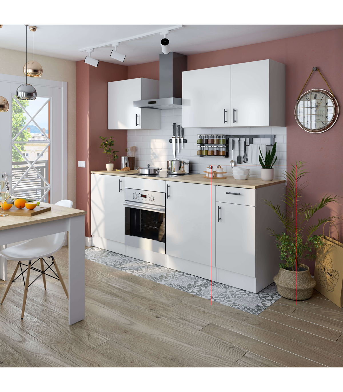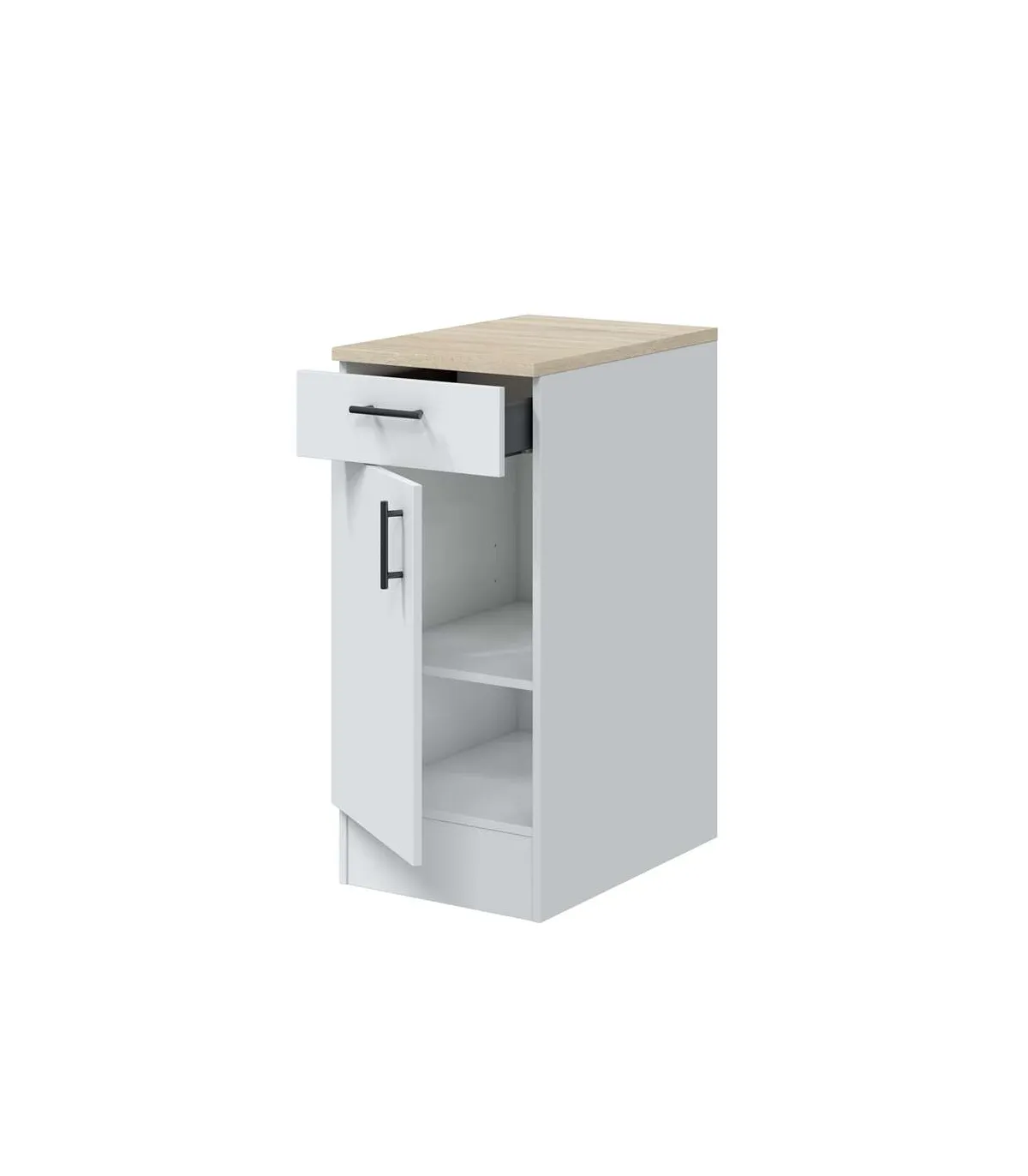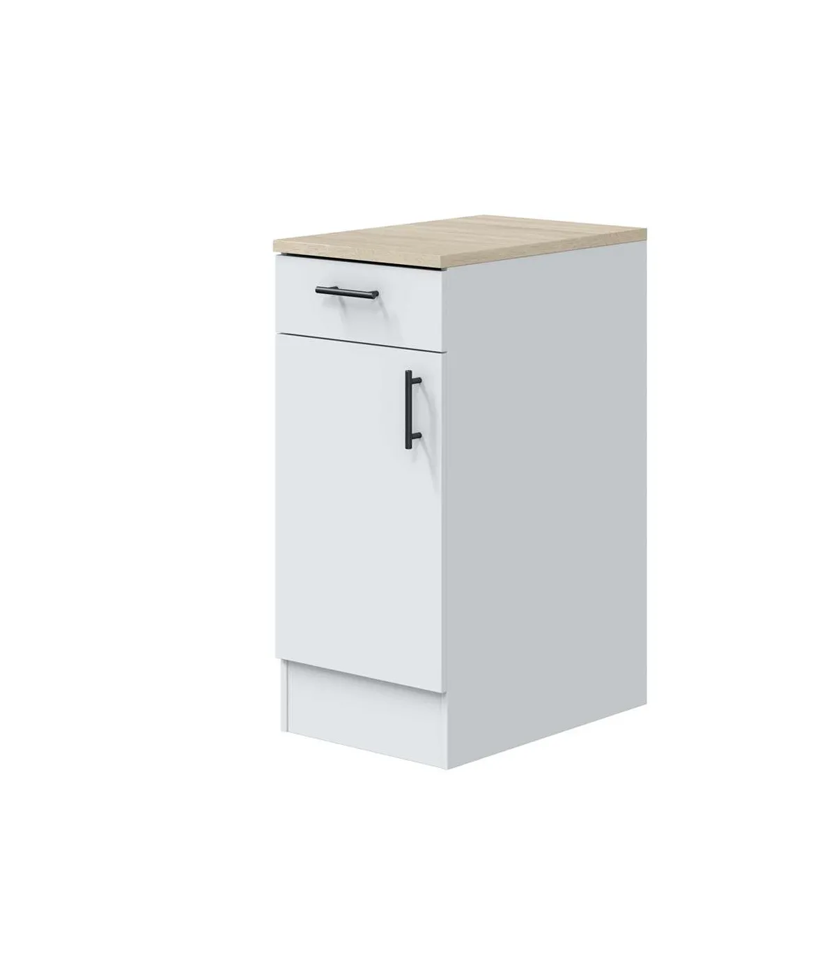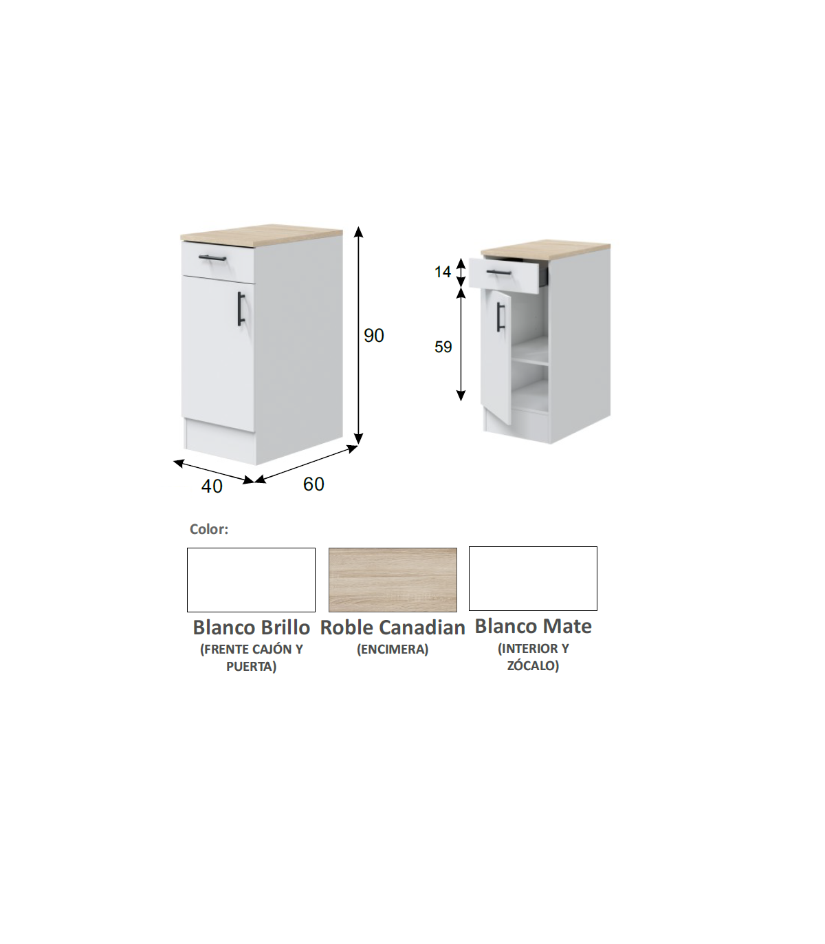 Mueble bajo para cocina 1 puerta 1 cajón Kira blanco brillo, encimera roble canadian. 90cm(alto) 40cm(ancho) 60cm(largo)