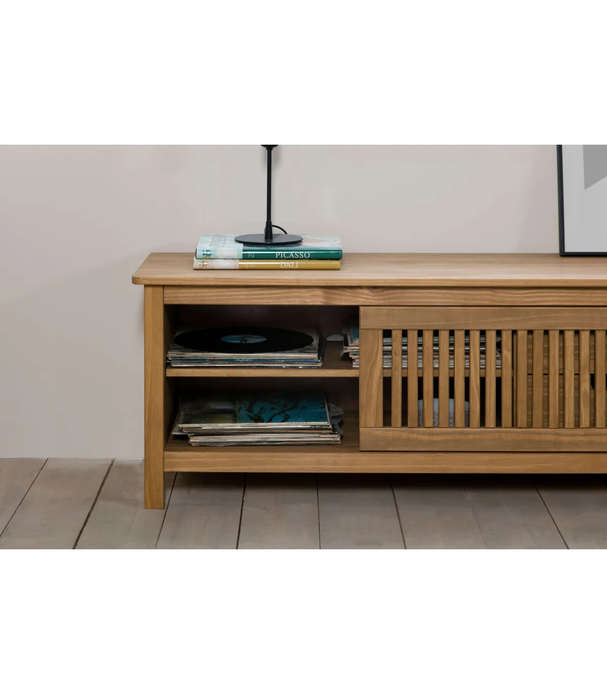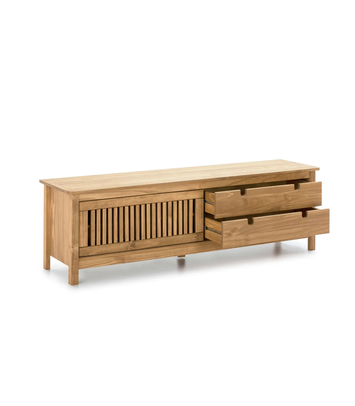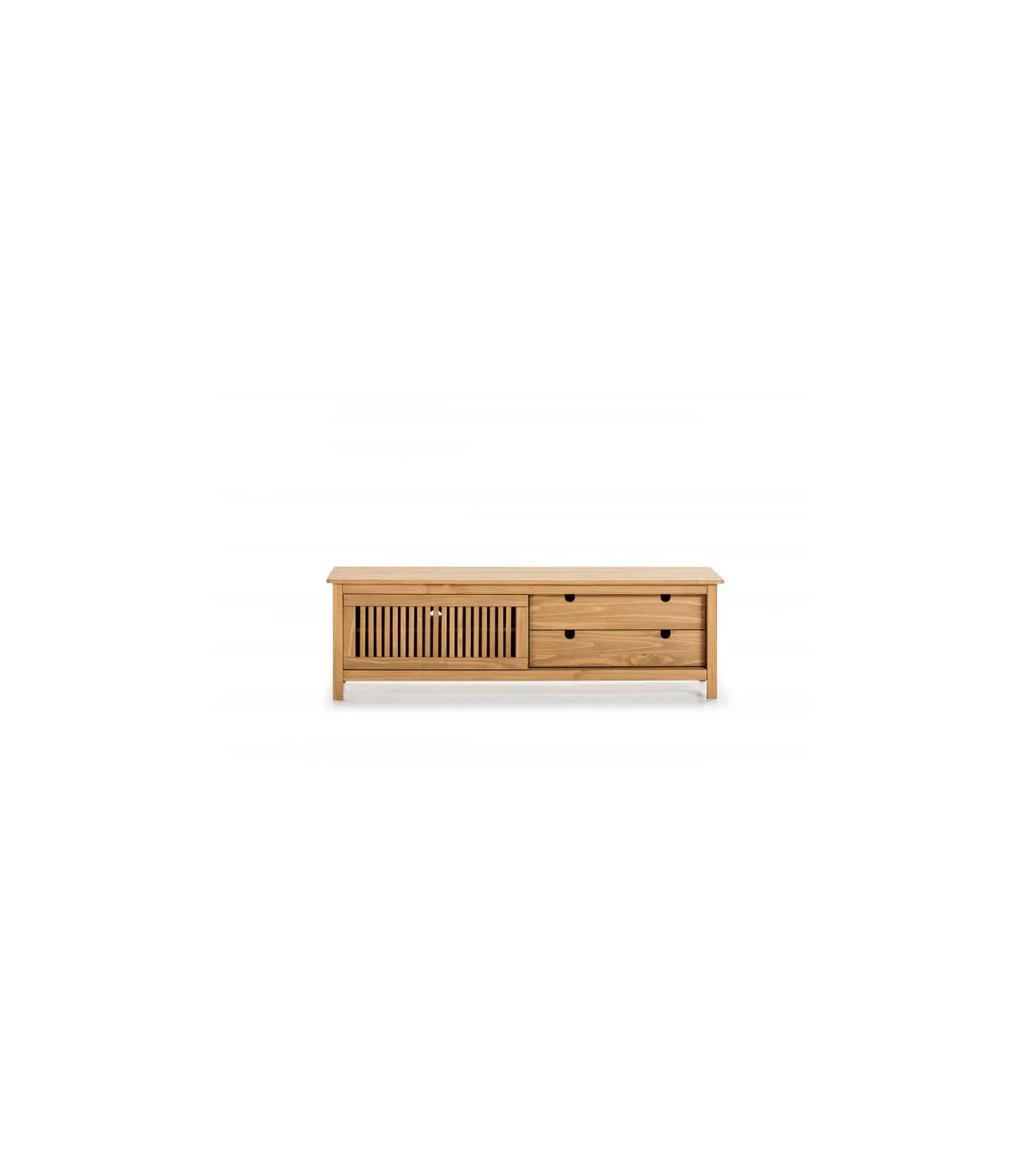 Este mueble para TV presenta dos cajones con guías metálicas, lo que permite un deslizamiento suave y fácil acceso a su contenido. Además, cuenta con una puerta corredera en madera de pino color natural con un acabado a la cera, lo que realza la belleza natural de la madera y aporta autenticidad al diseño. La puerta corredera guarda en su interior una balda, ofreciendo espacio adicional para guardar tus dispositivos electrónicos y accesorios.