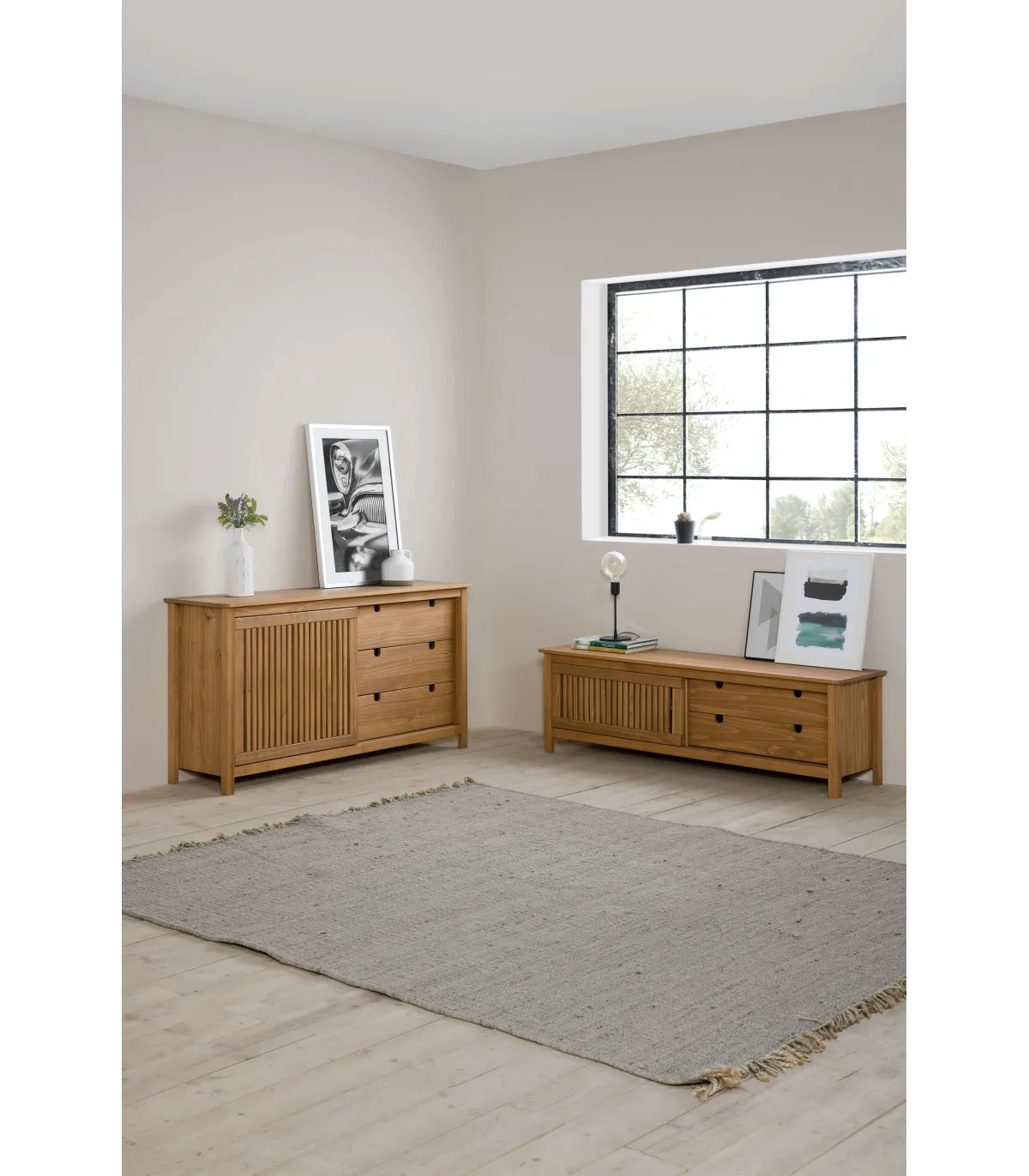 El mueble para TV de la colección Luna en estilo nórdico es una pieza elegante y funcional diseñada para realzar tu espacio de entretenimiento con un toque moderno y acogedor. Fabricado con madera de pino de alta calidad, este mueble combina belleza y utilidad de manera armoniosa.