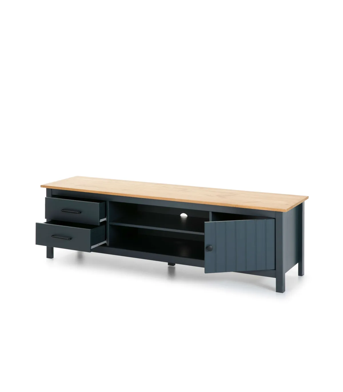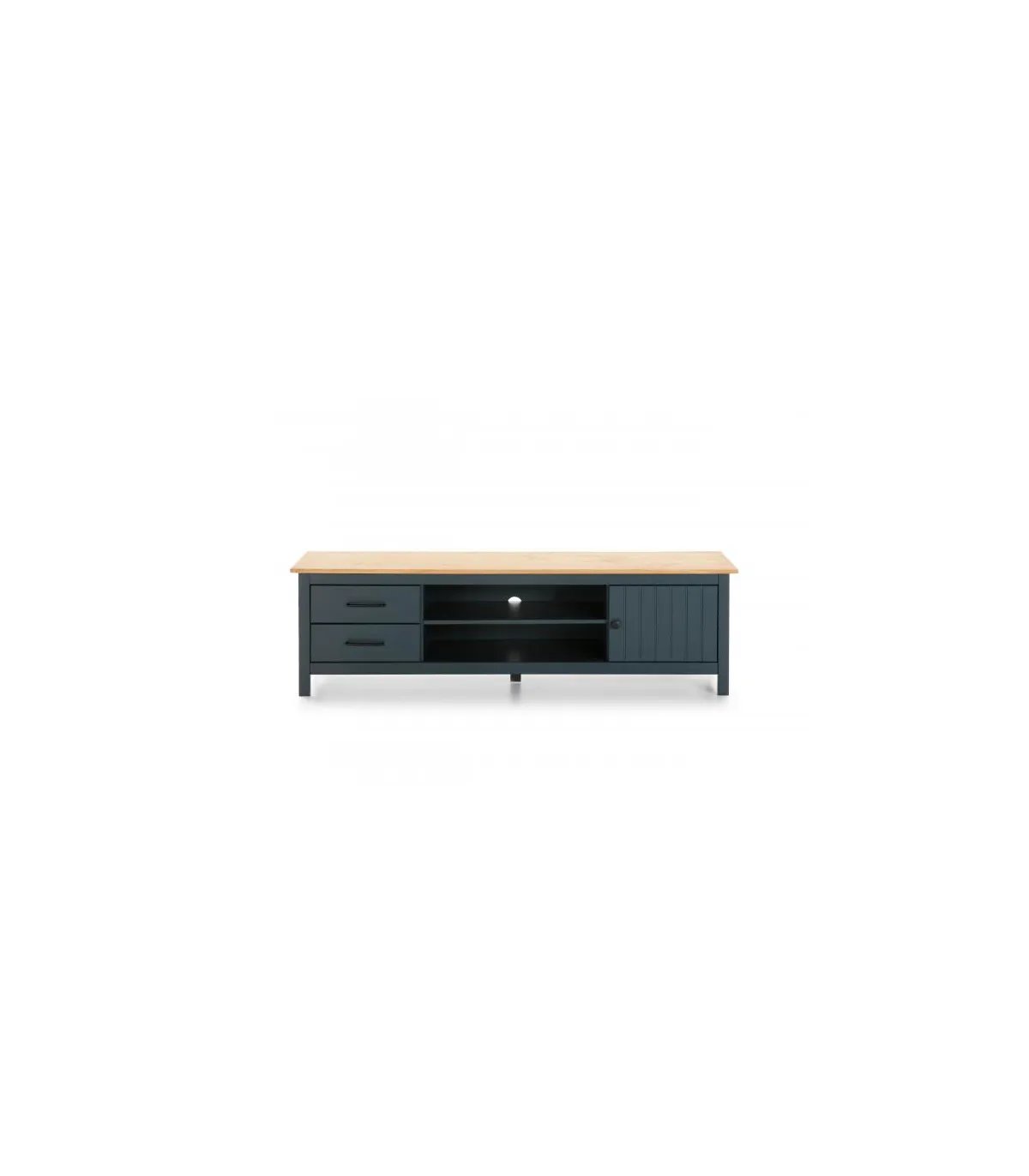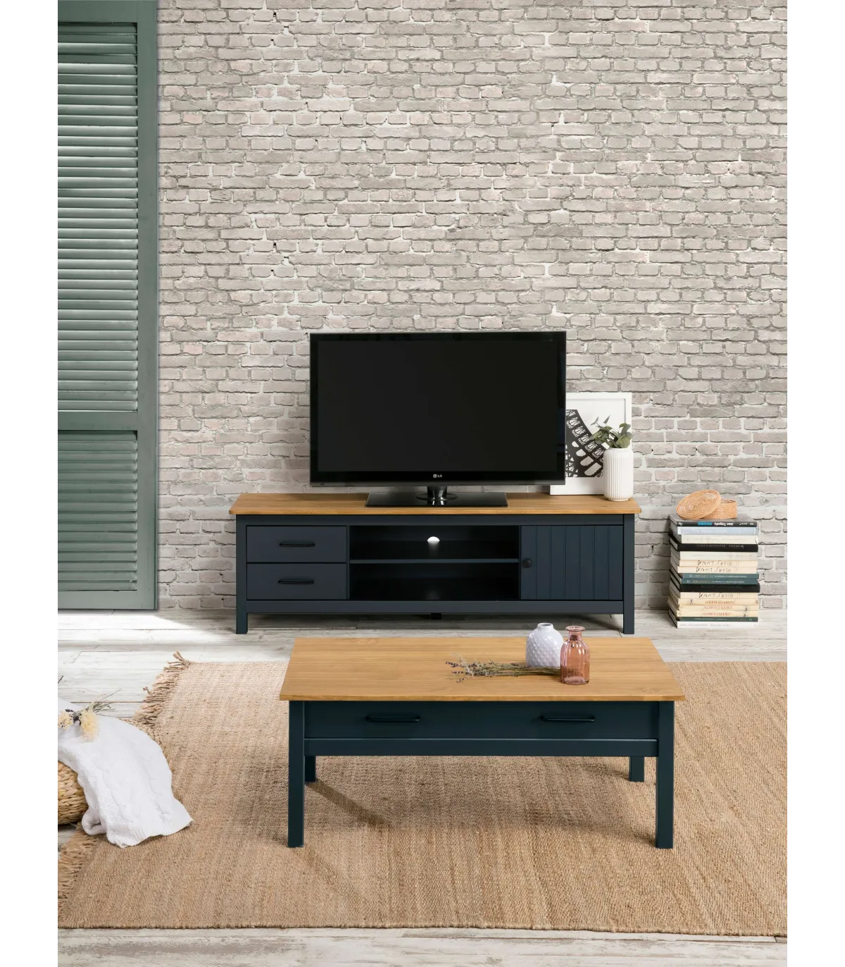 El mueble para TV Mariana cuenta con dos cajones equipados con guías metálicas, lo que asegura un deslizamiento suave y fácil acceso a tus objetos. Además, presenta una puerta abatible en madera de pino color azul, que añade un toque de frescura y estilo. La tapa superior está realizada en madera color natural con un acabado a la cera, realzando la belleza y autenticidad de la madera.