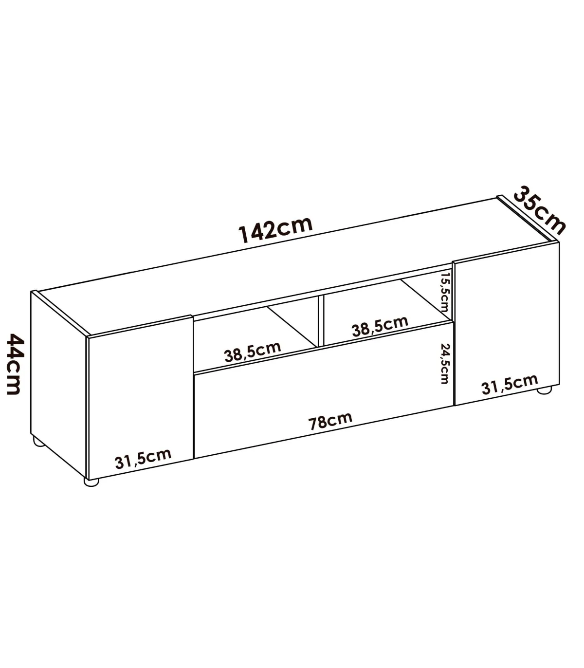 Sus dimensiones de 43,8 cm de alto, 141,7 cm de ancho y 34,7 cm de fondo hacen del Mueble Bajo TV Isola una opción versátil y compacta que se adapta fácilmente a cualquier espacio.