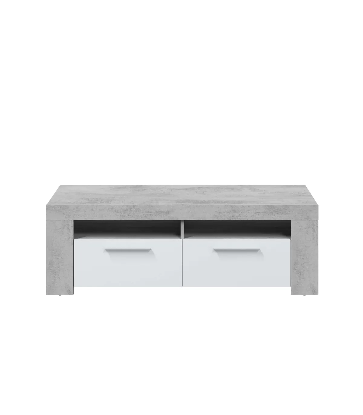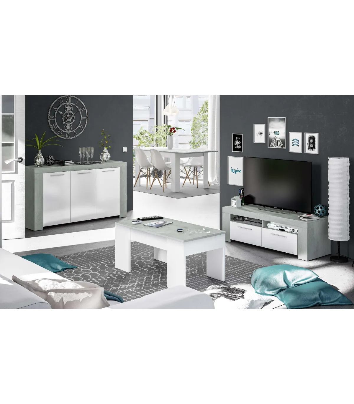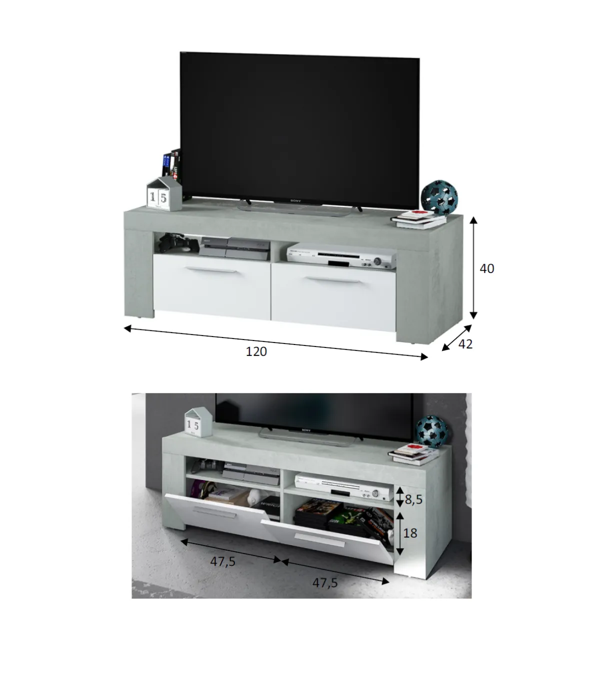 Este mueble de televisión en cemento y blanco artik es una pieza elegante y funcional, con dos puertas y dos compartimentos superiores abiertos para organizar dispositivos multimedia y cables.