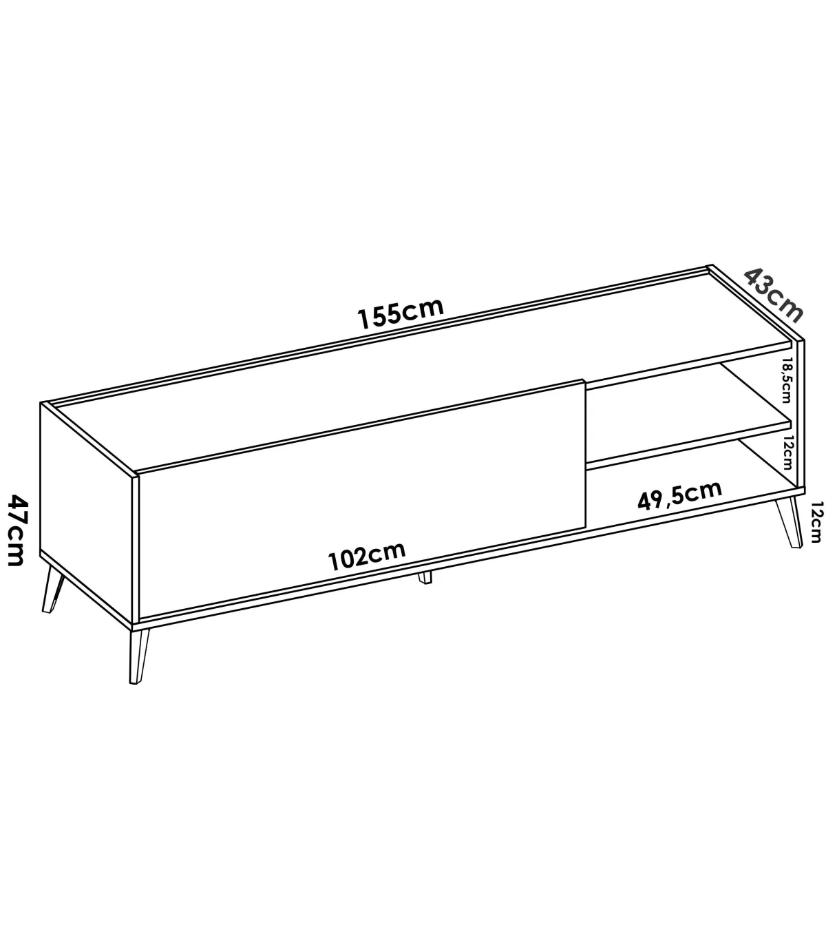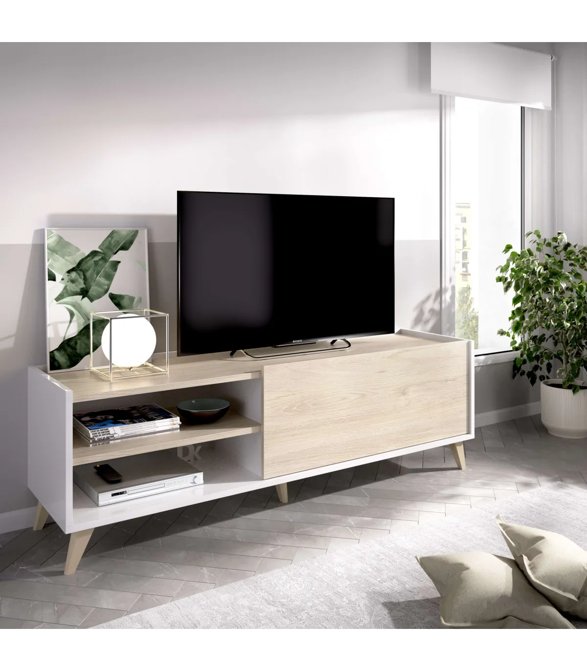 El Mueble Bajo TV cuenta con una puerta abatible y 2 huecos, patas en madera maciza natural que aportan un toque sofisticado y elegante.