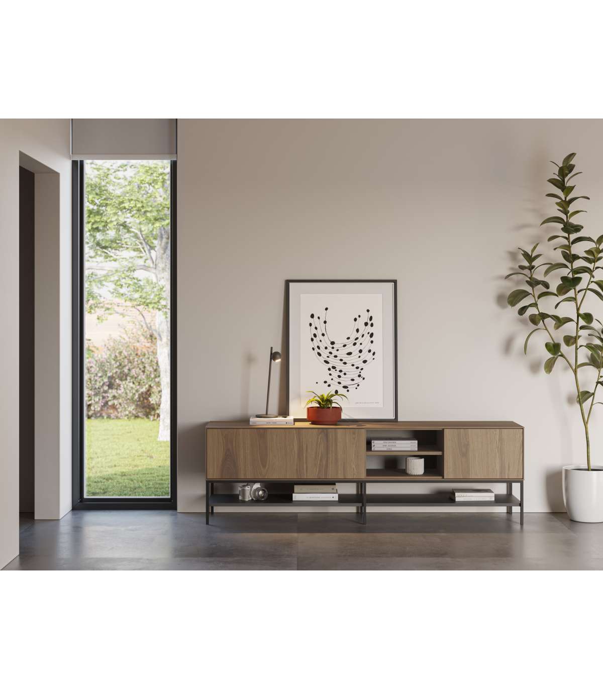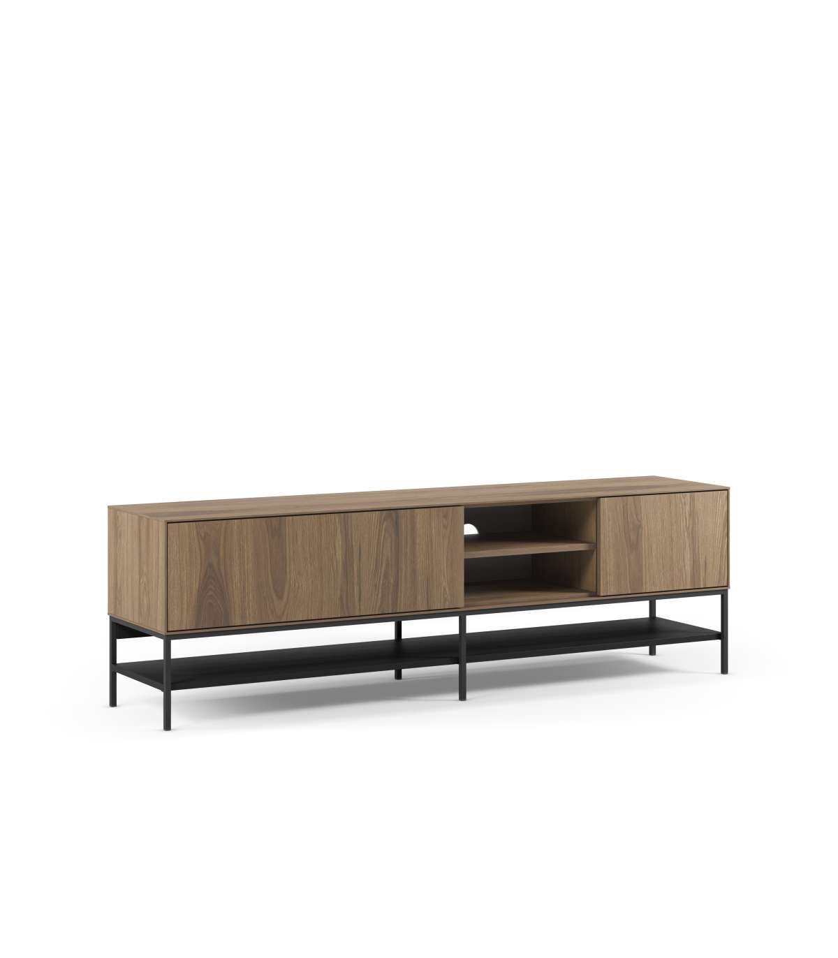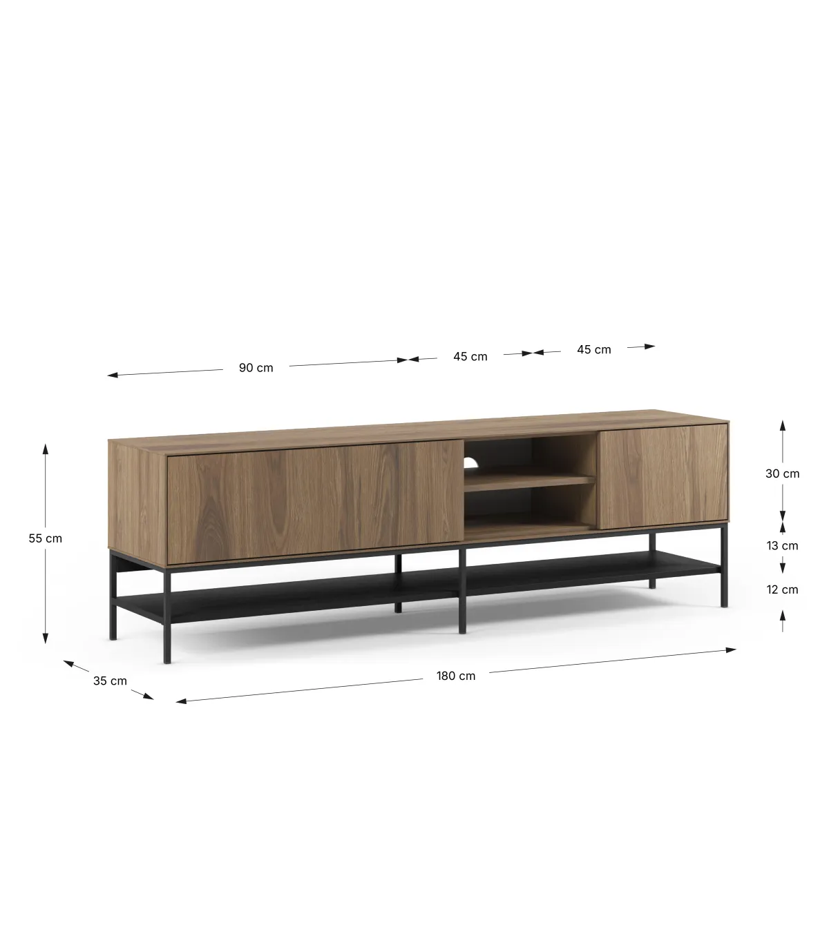 Dispone de 2 puertas que ofrecen espacio de almacenamiento cerrado y 2 huecos abiertos, perfectos para colocar dispositivos electrónicos, decodificadores o elementos decorativos. Sus patas metálicas proporcionan estabilidad y un diseño ligero y actual.